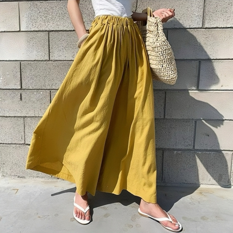 寬鬆薄款棉麻鬆緊腰闊腿復古純色百搭九分褲