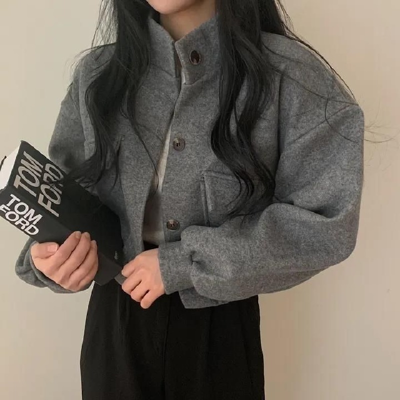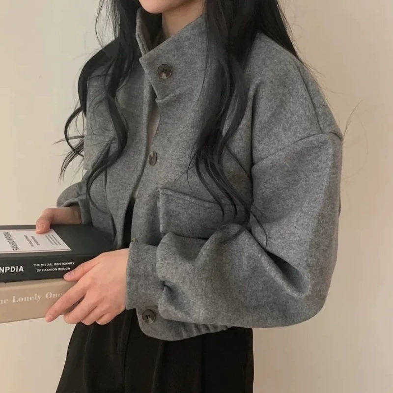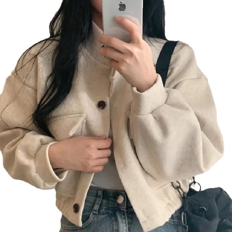 復古俏皮立領短款慵懶風寬鬆休閒呢子外套開衫
