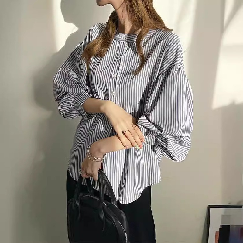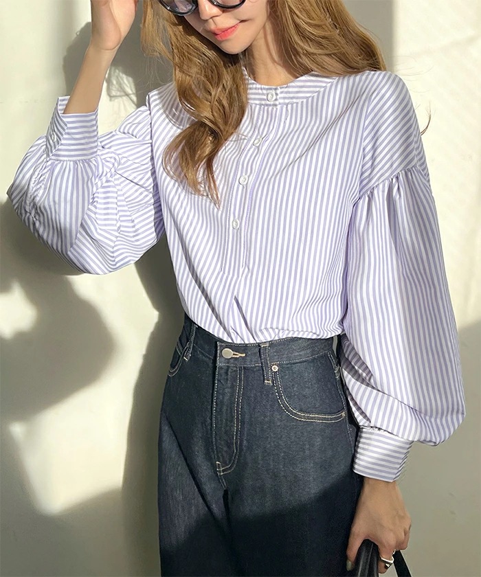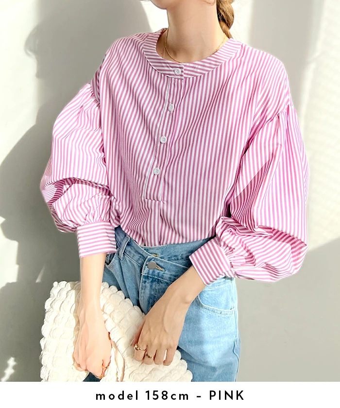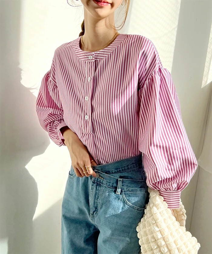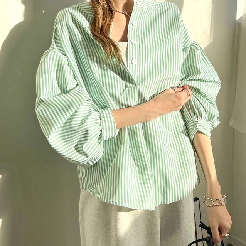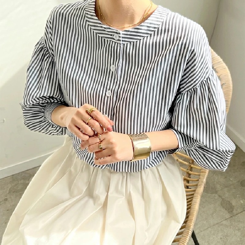 春夏甜美清新泡泡袖圓領排扣彩色條紋燈籠袖襯衫