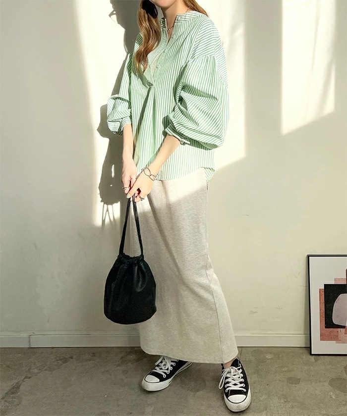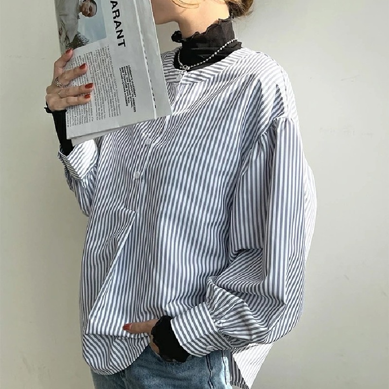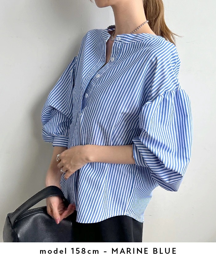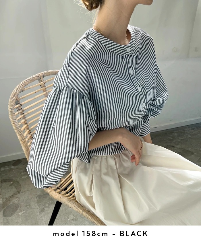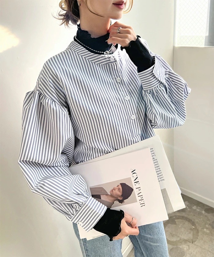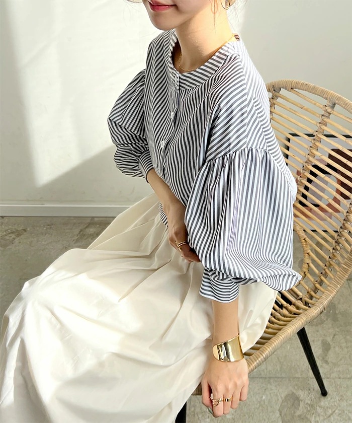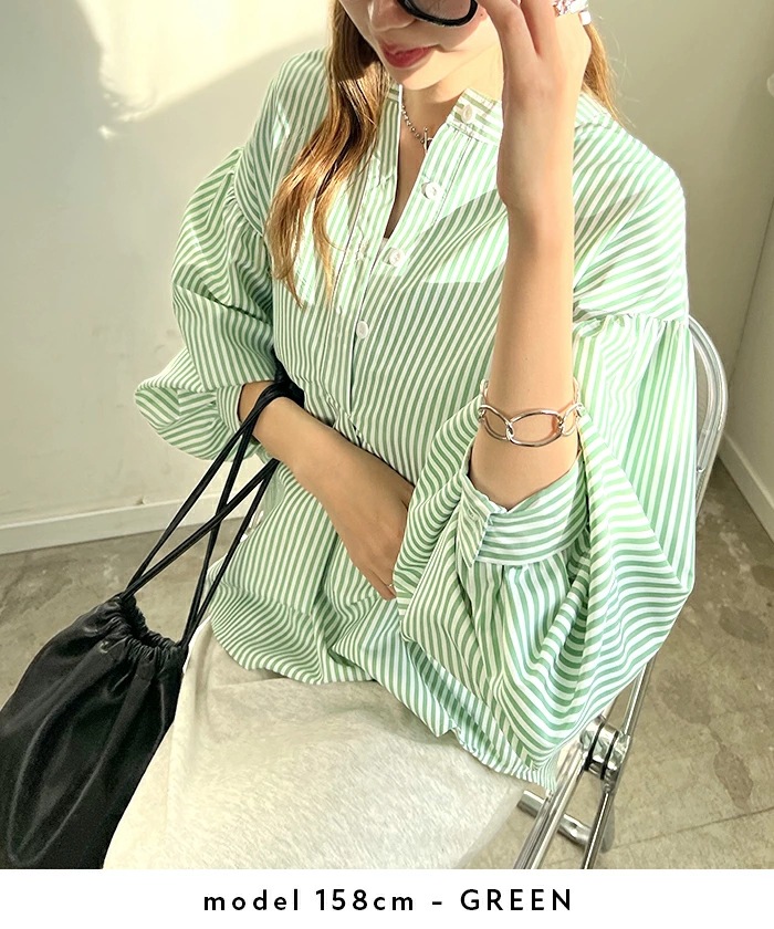 春夏甜美清新泡泡袖圓領排扣彩色條紋燈籠袖襯衫
