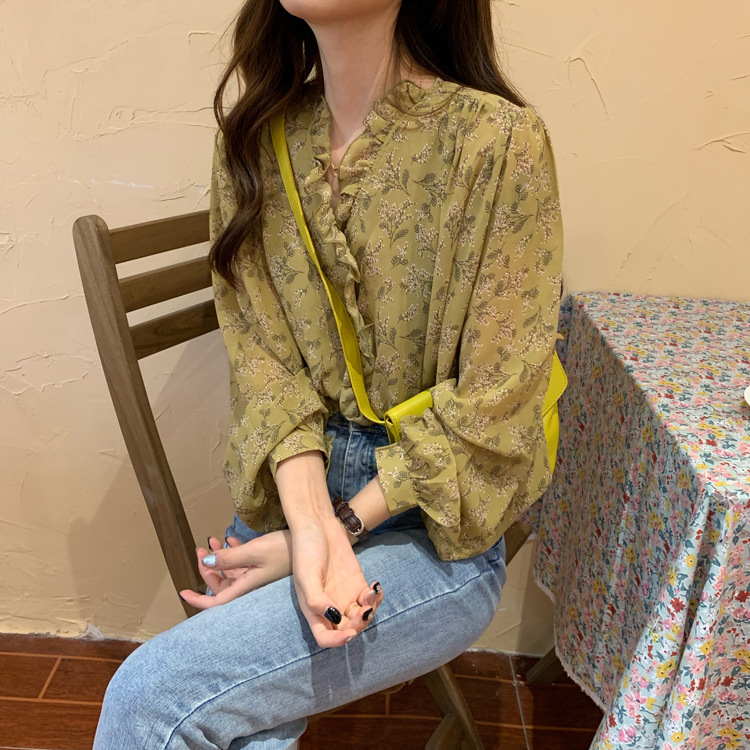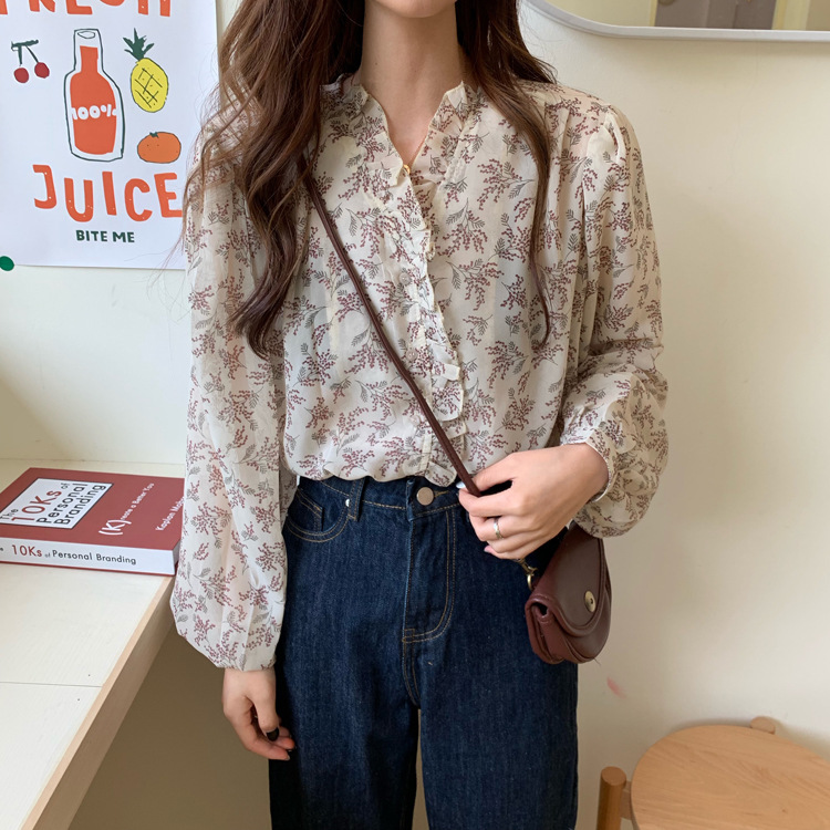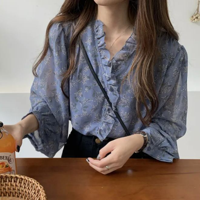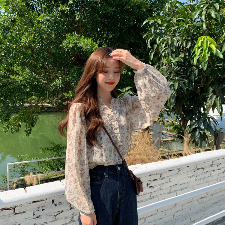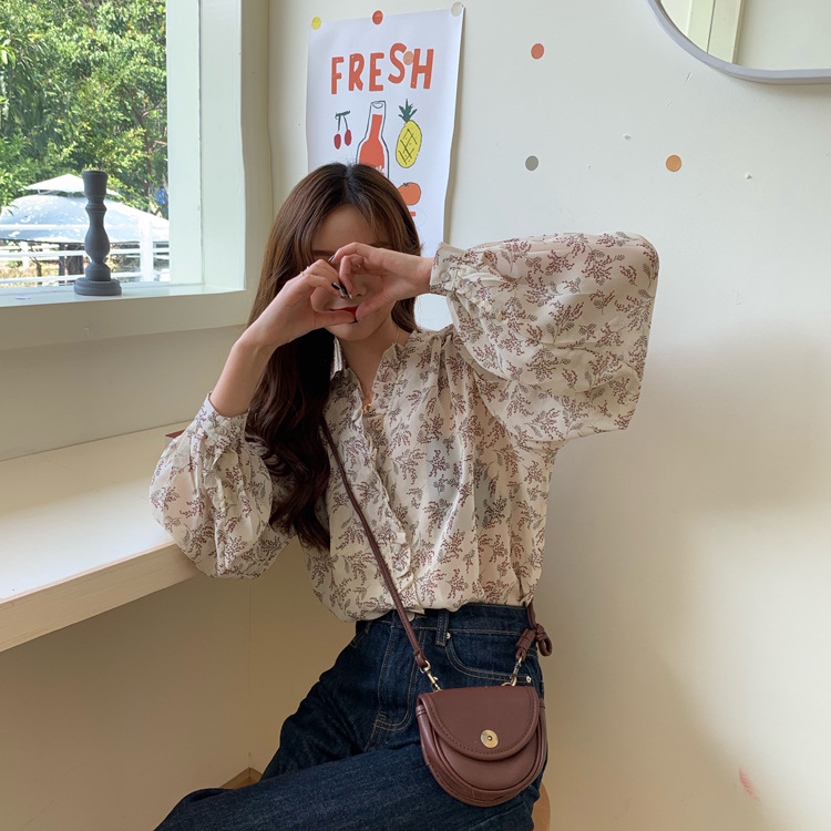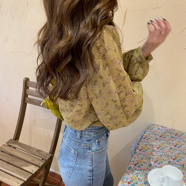 韓系溫柔風碎花雪紡打底泡泡長袖襯衫