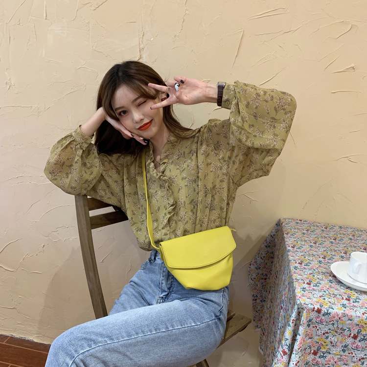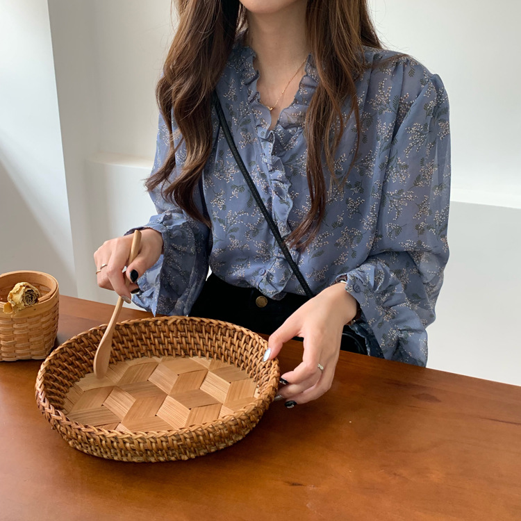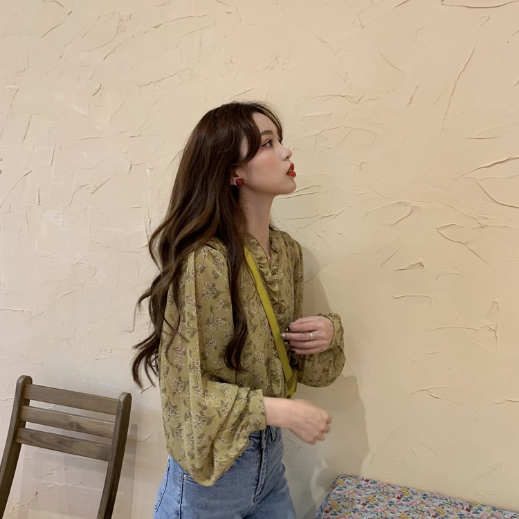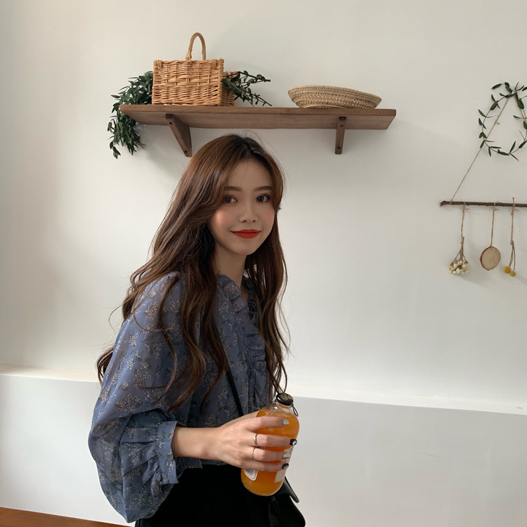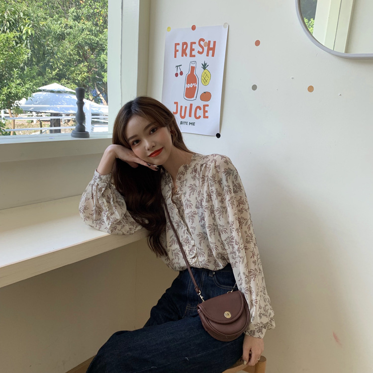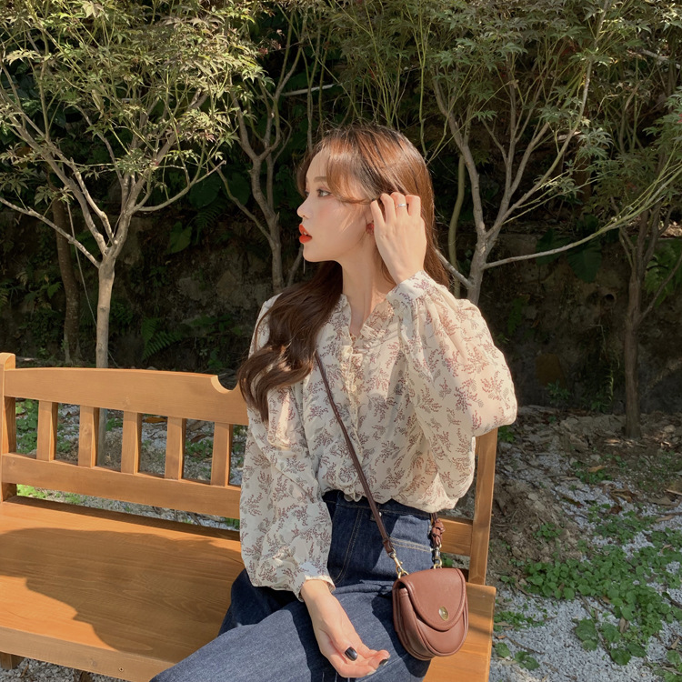 韓系溫柔風碎花雪紡打底泡泡長袖襯衫