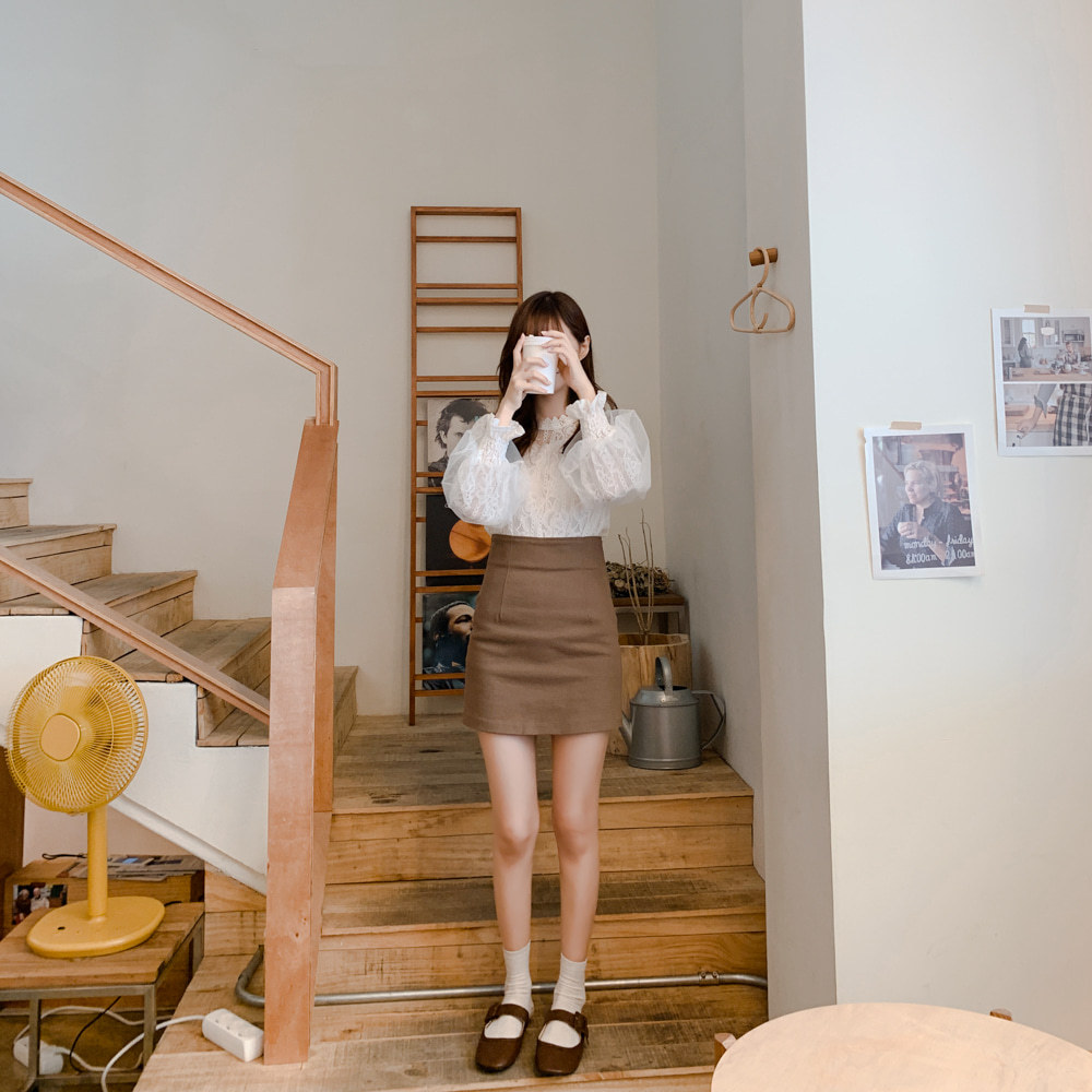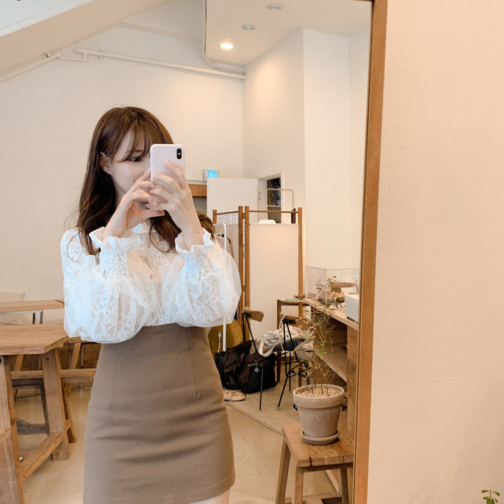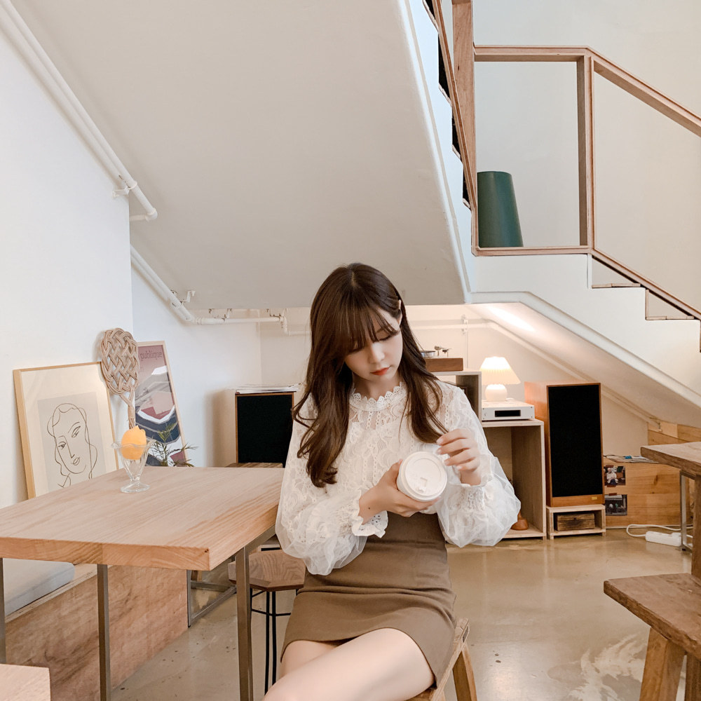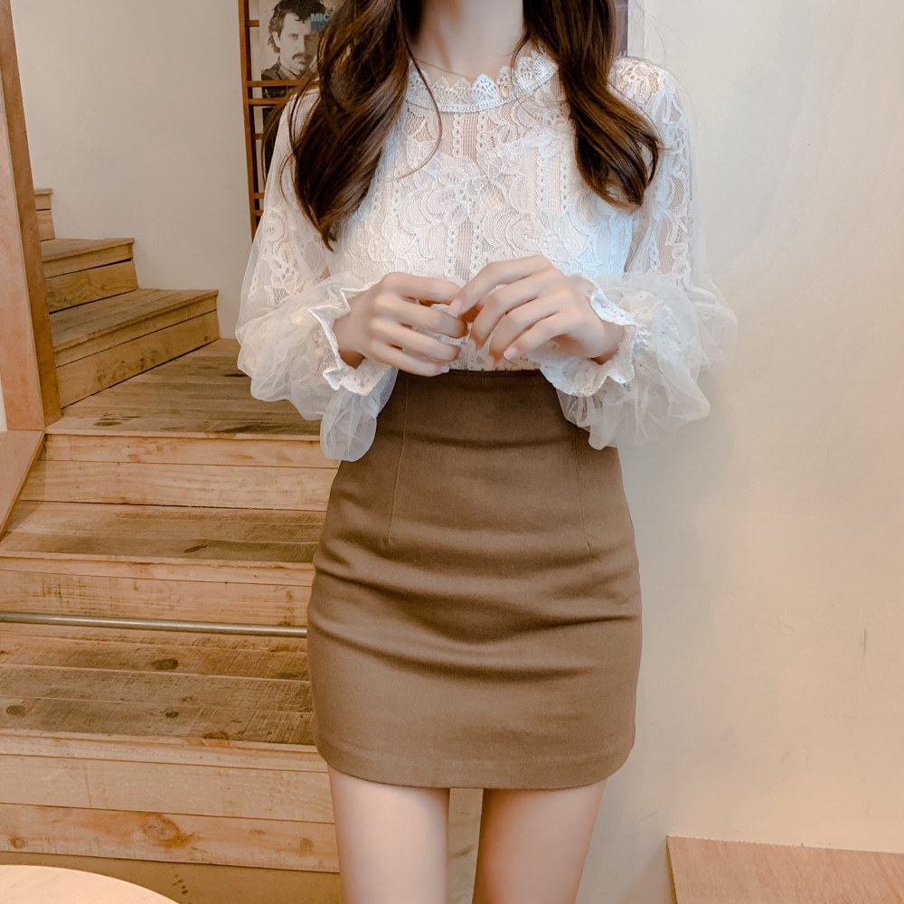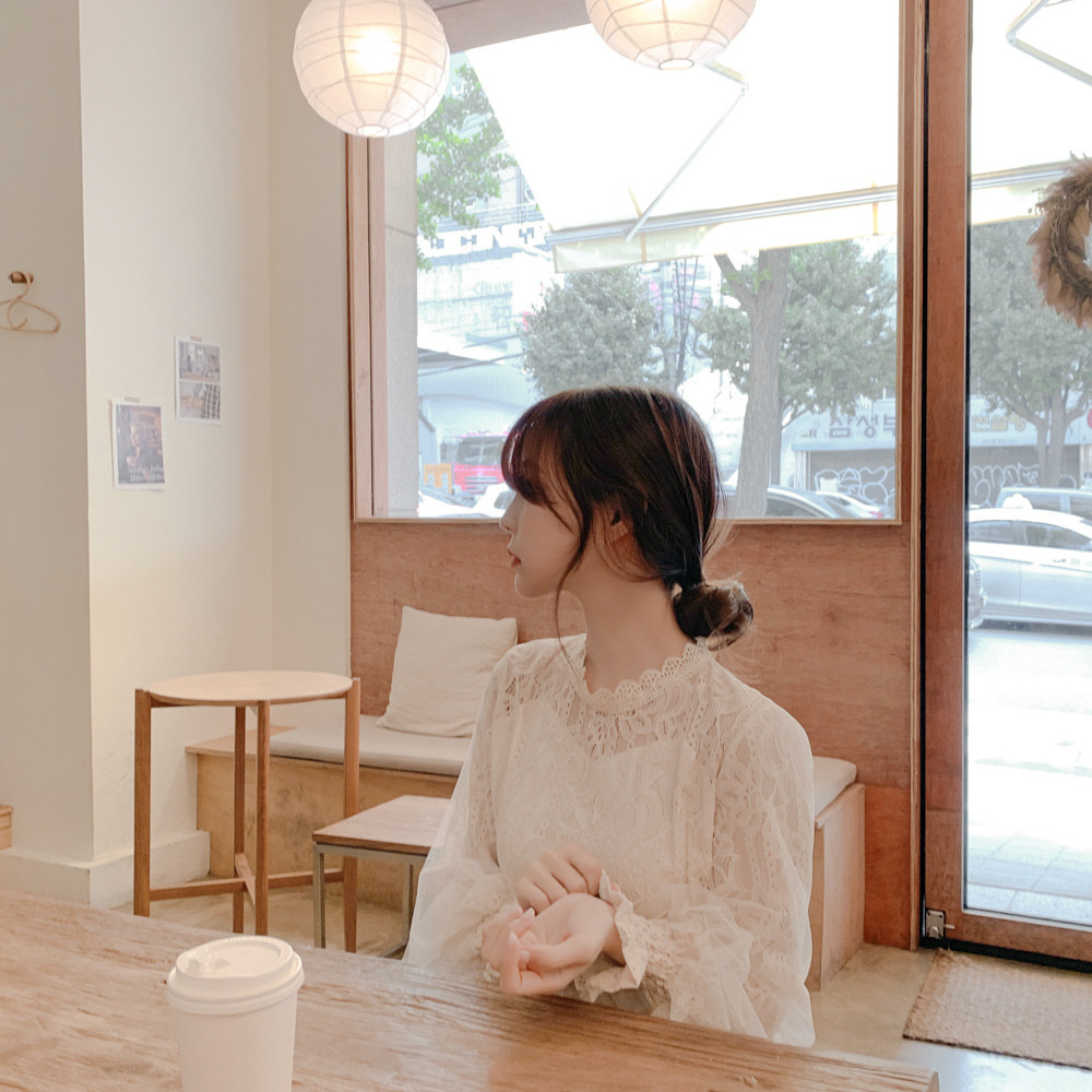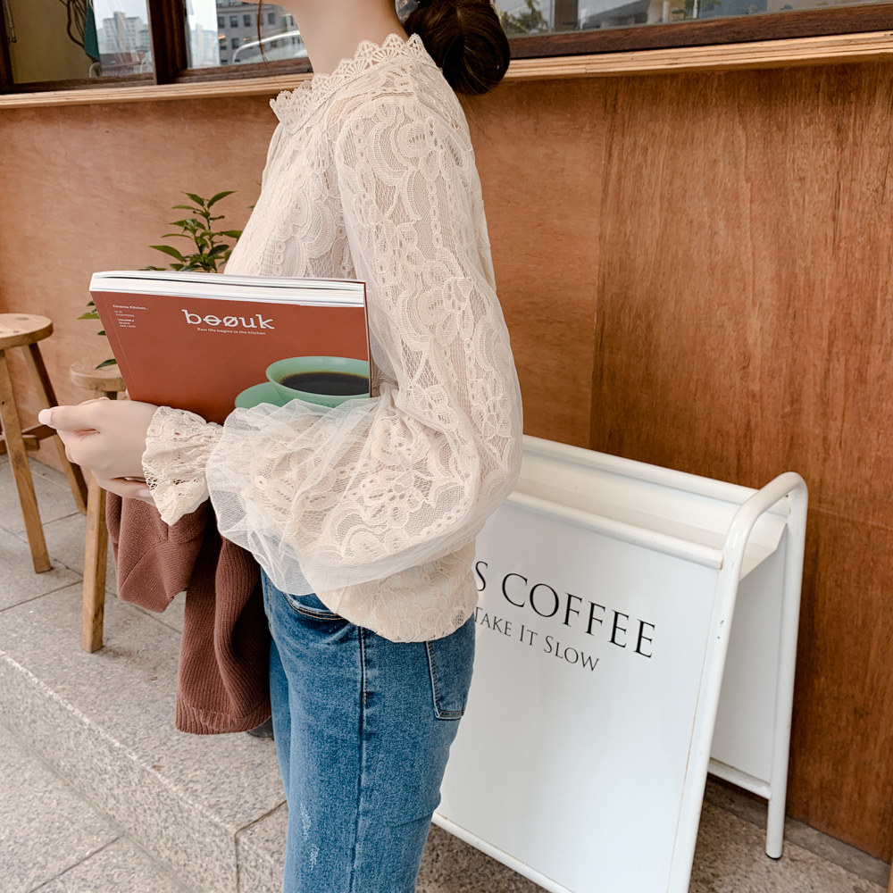 春秋復古蕾絲花邊拼接小立領網紗泡泡長袖襯衫