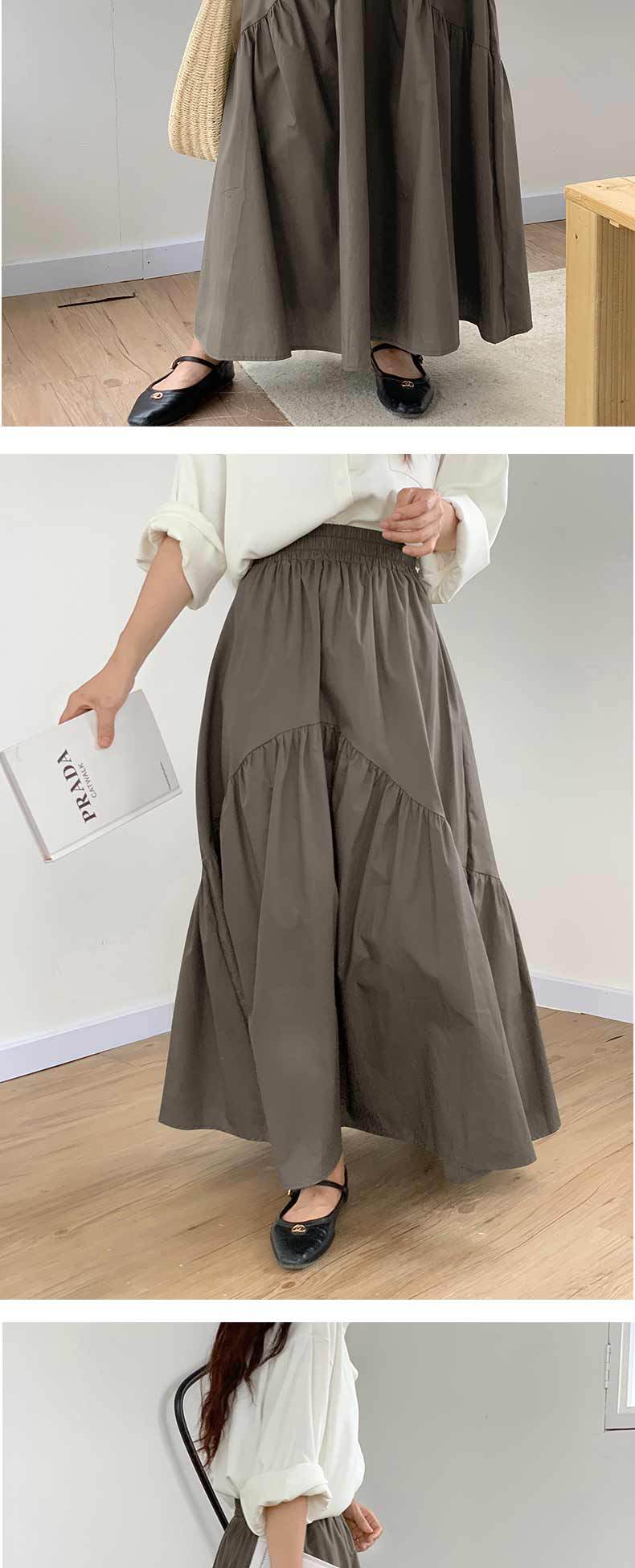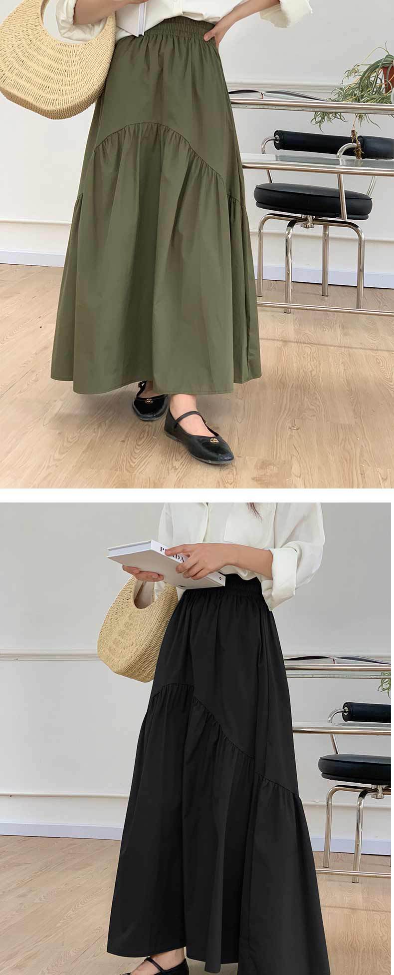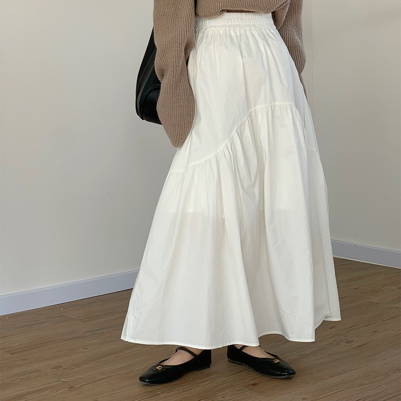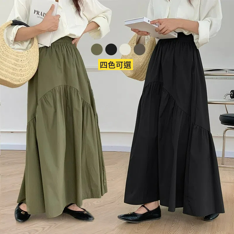 休閒百搭復古波浪抽褶高腰純色魚尾裙大擺半身裙