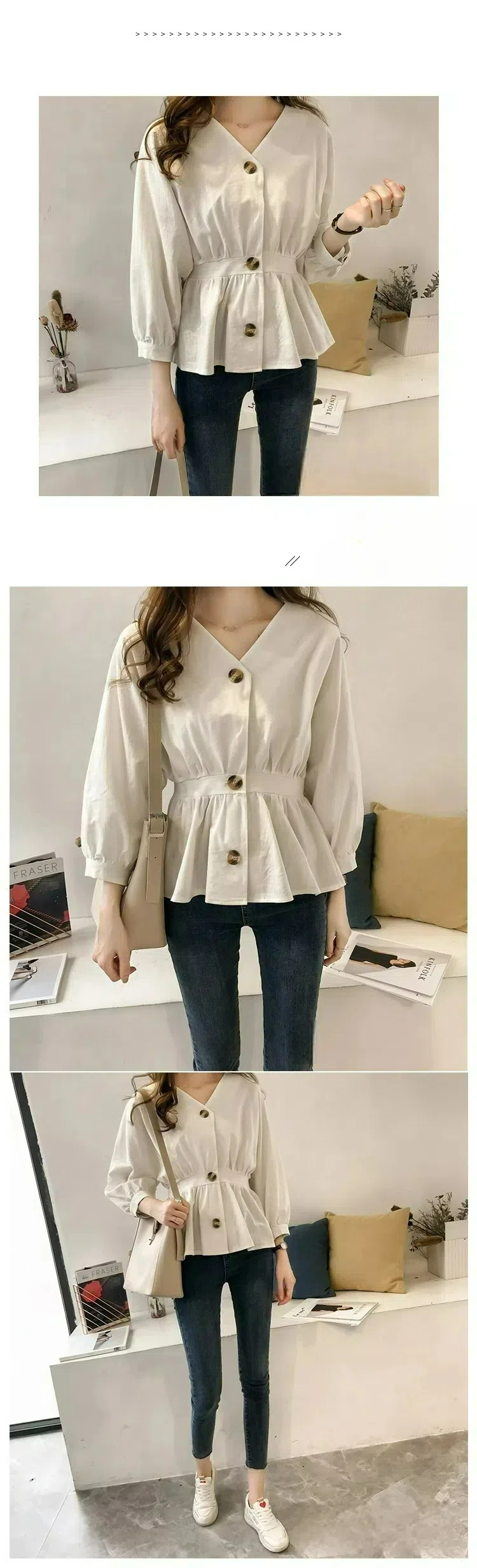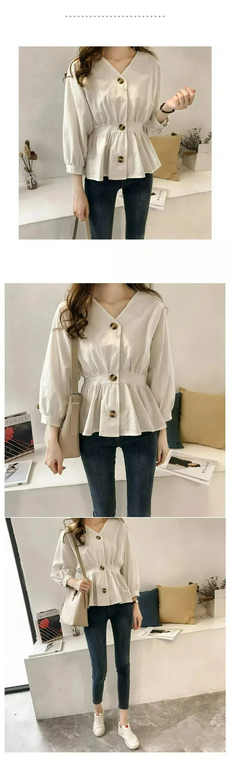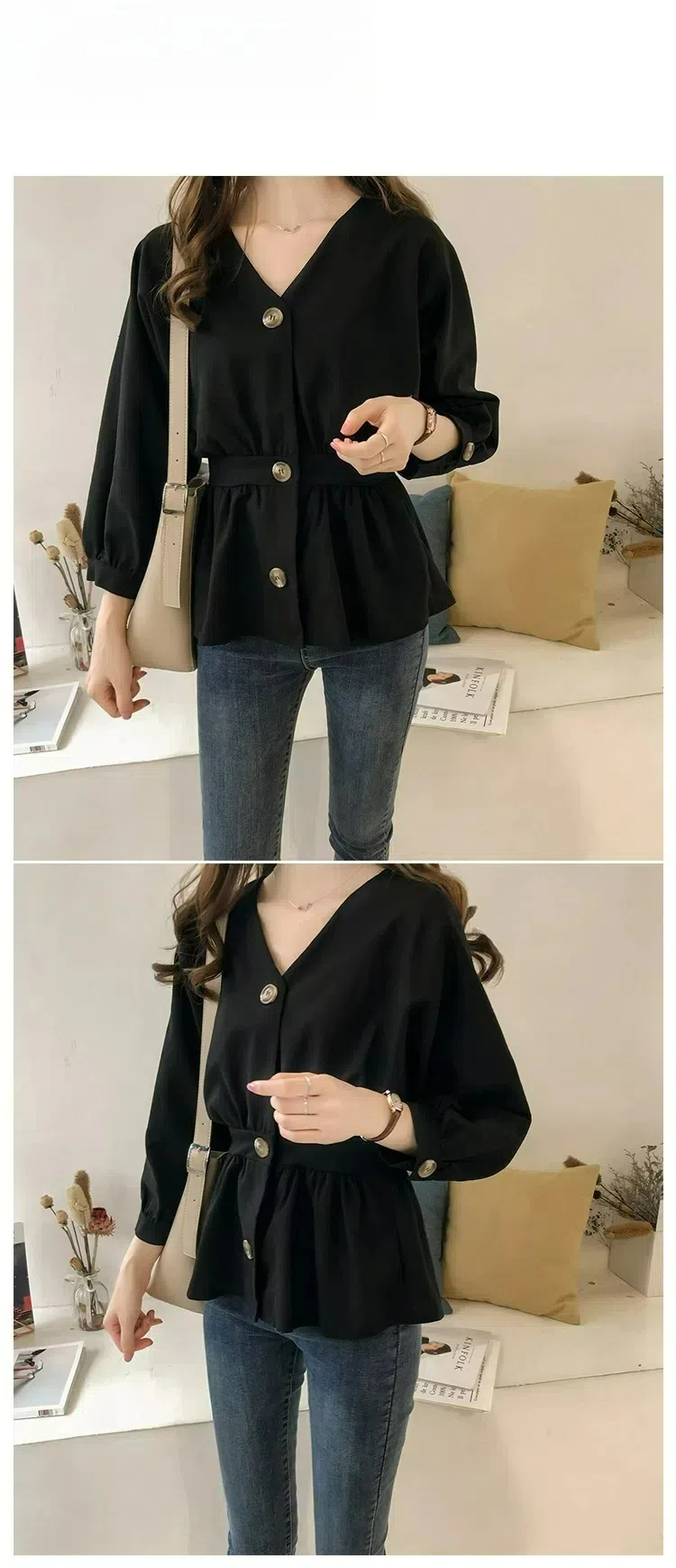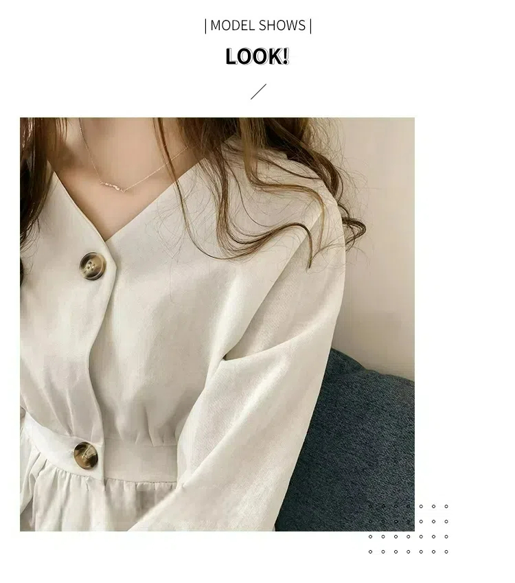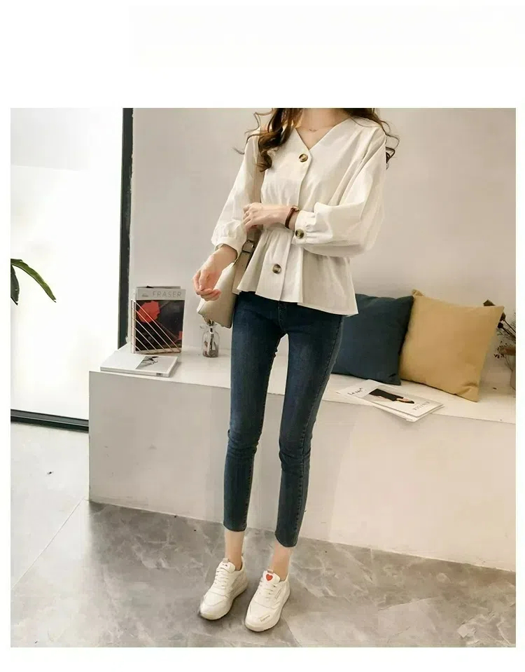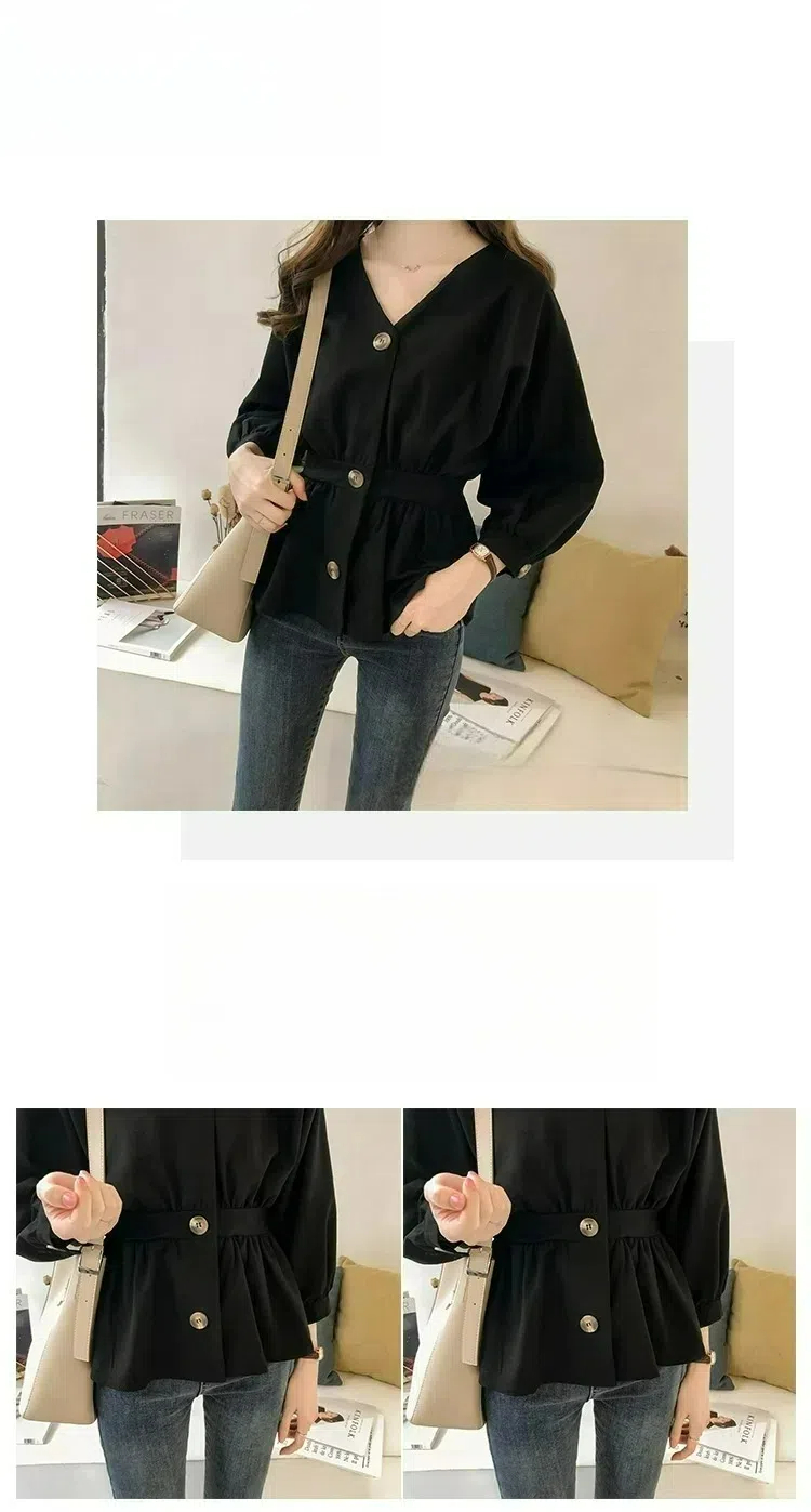 韓系氣質收腰顯瘦V領紐扣長袖襯衫