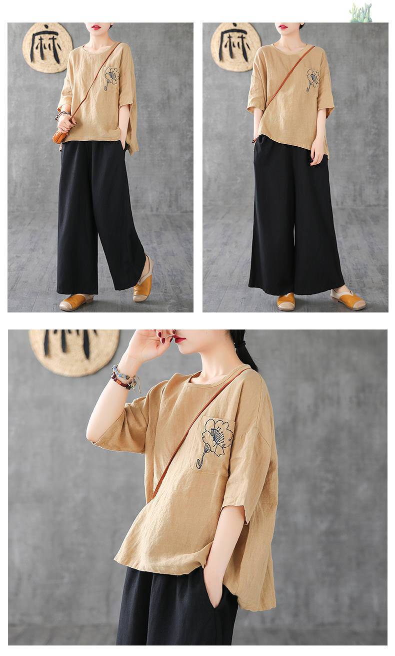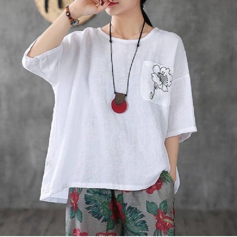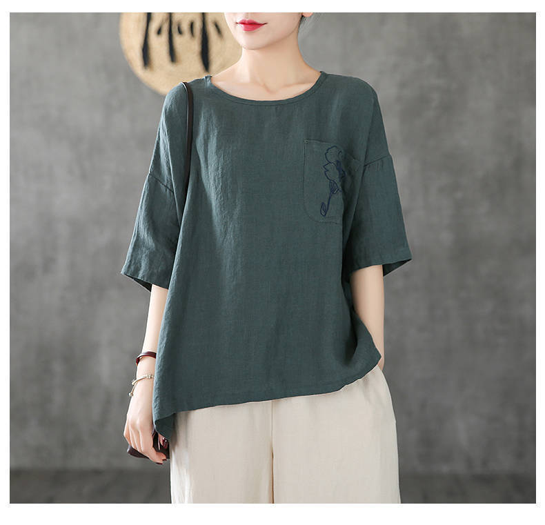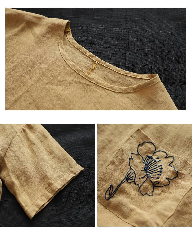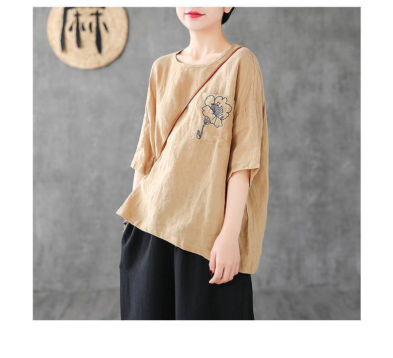 休閒刺繡棉麻透氣寬鬆圓領短袖T恤