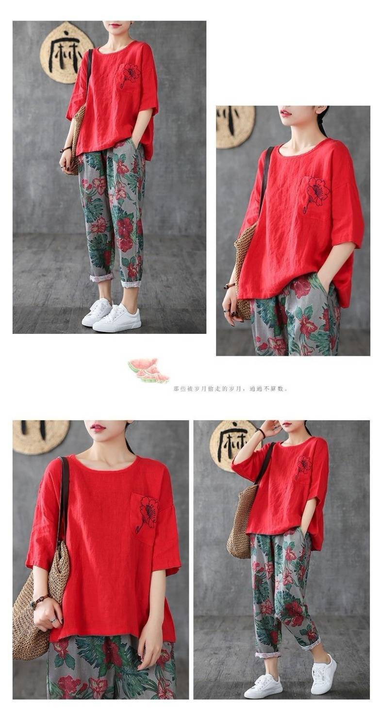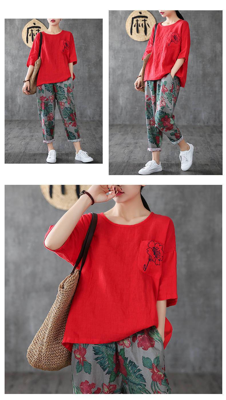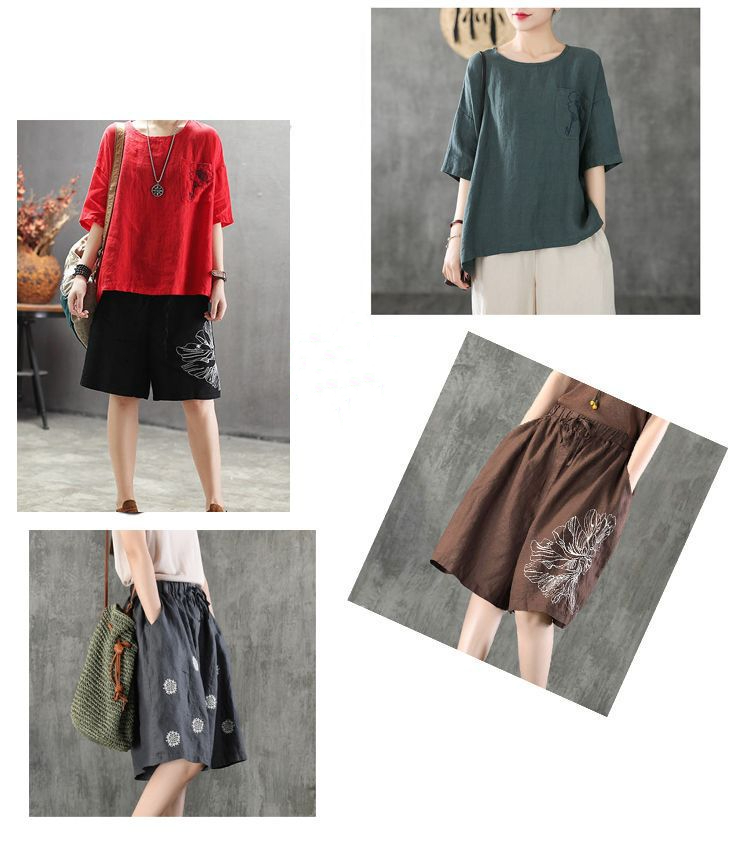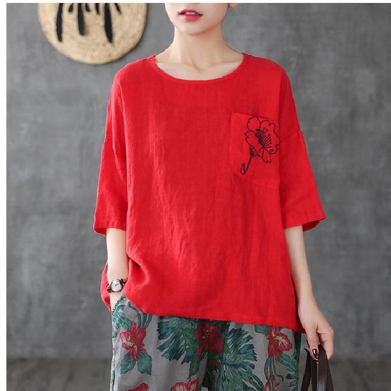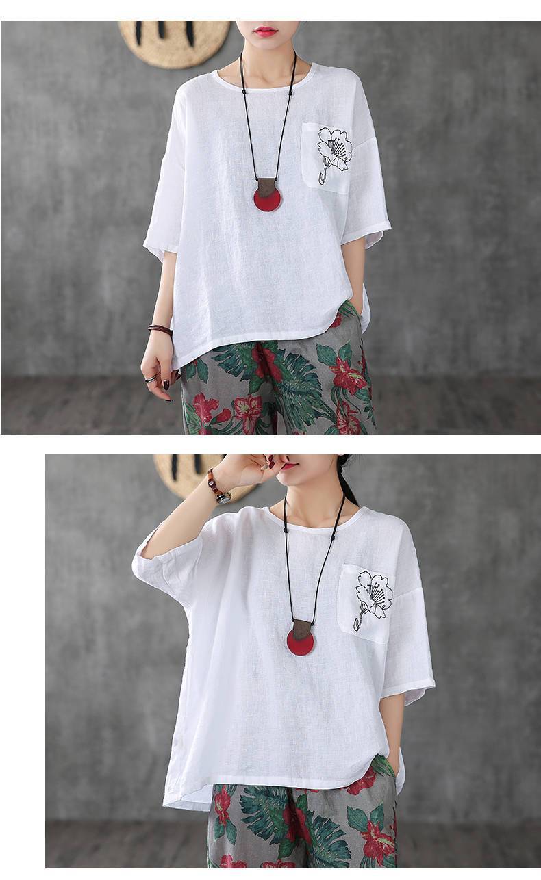 休閒刺繡棉麻透氣寬鬆圓領短袖T恤