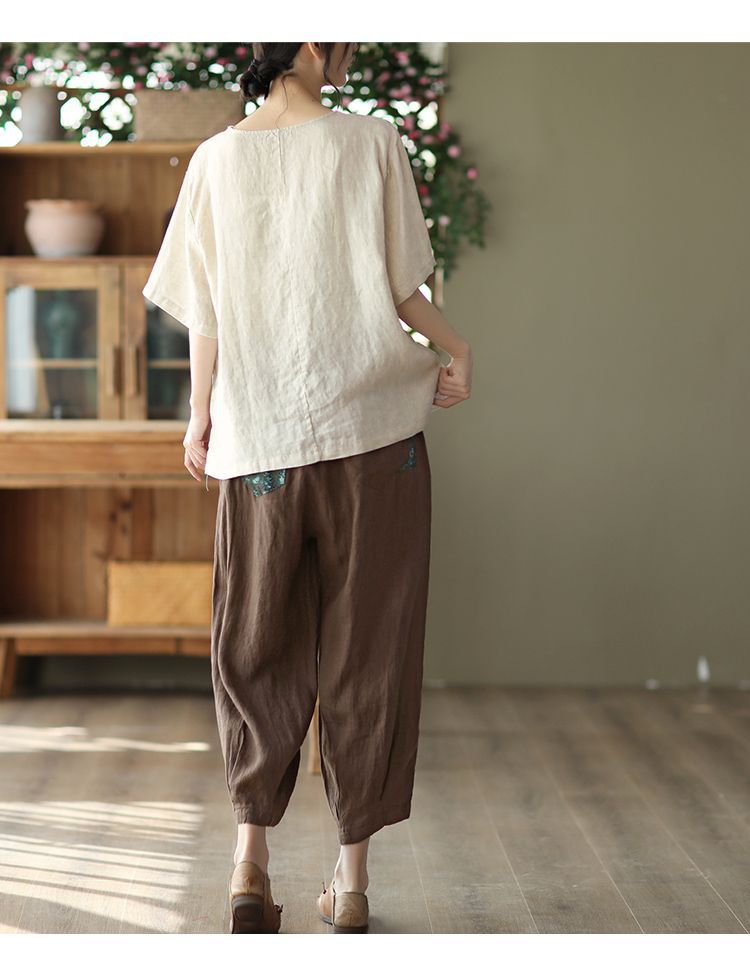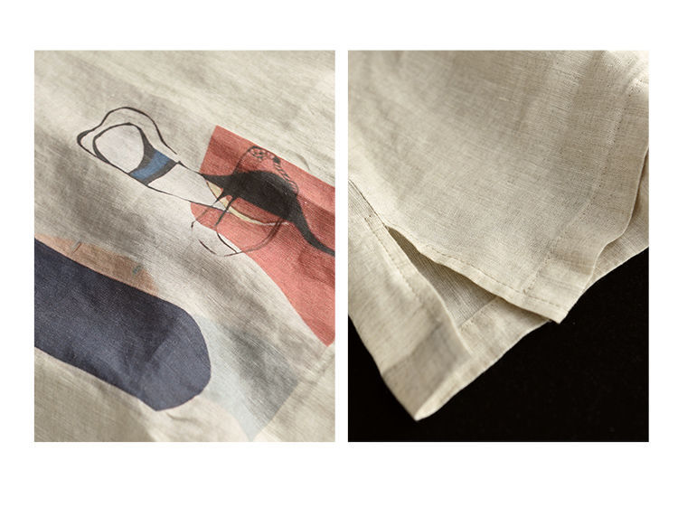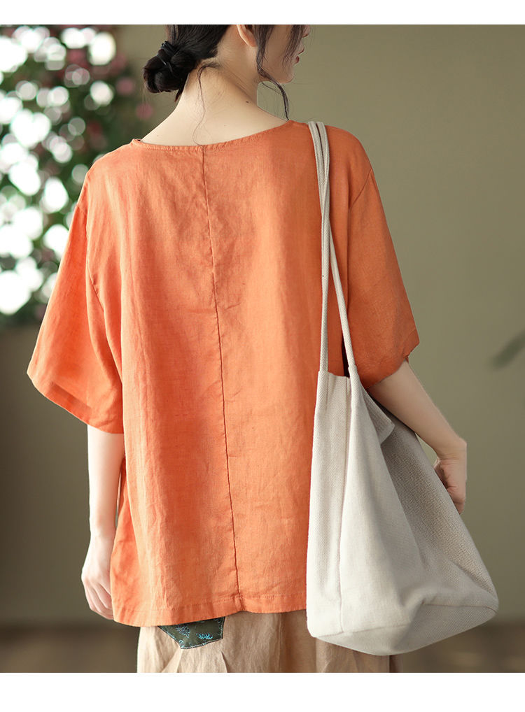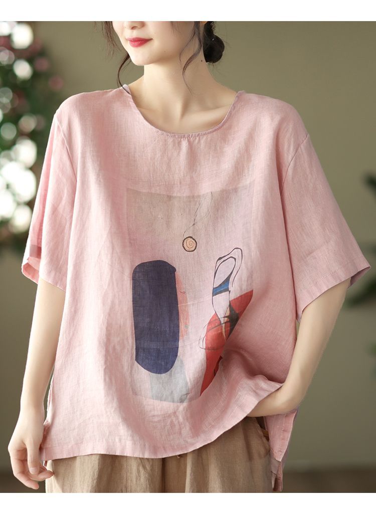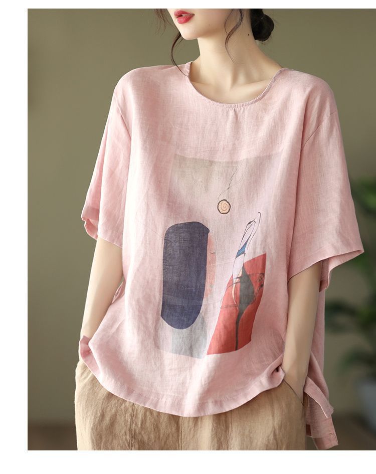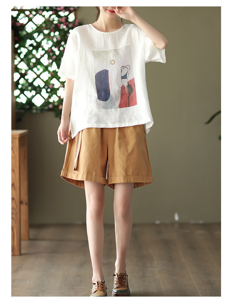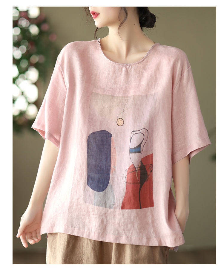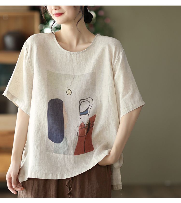 寬鬆百搭圓領印花棉麻復古套頭短袖T恤