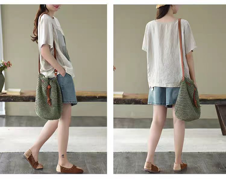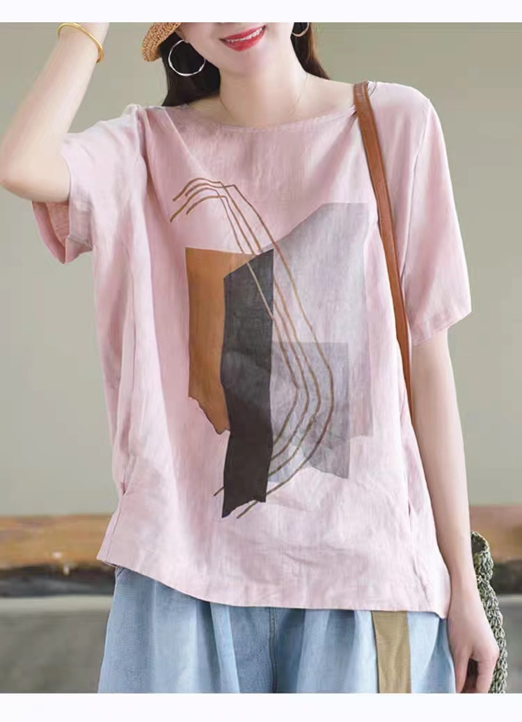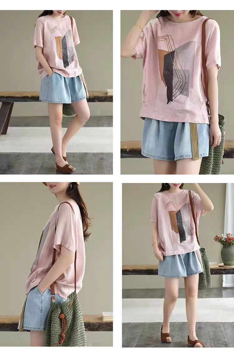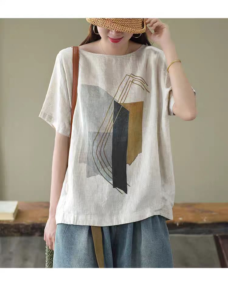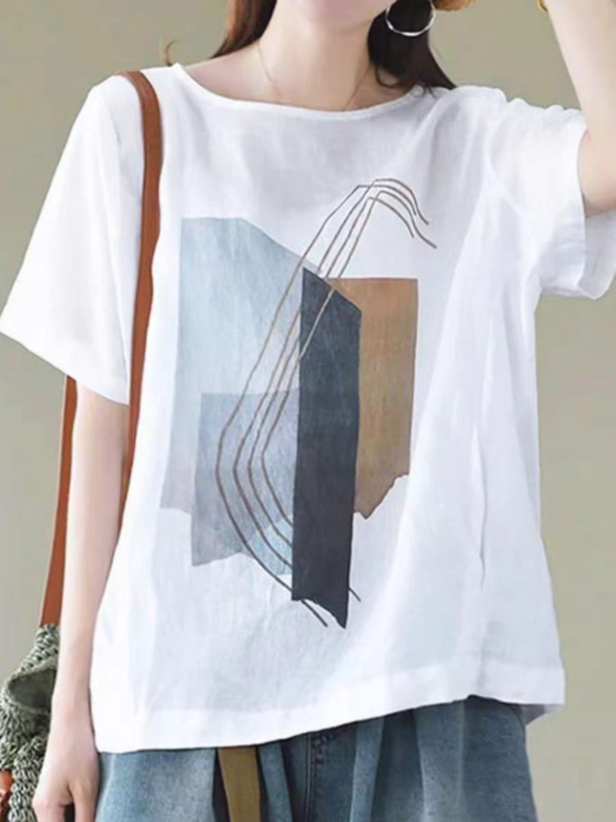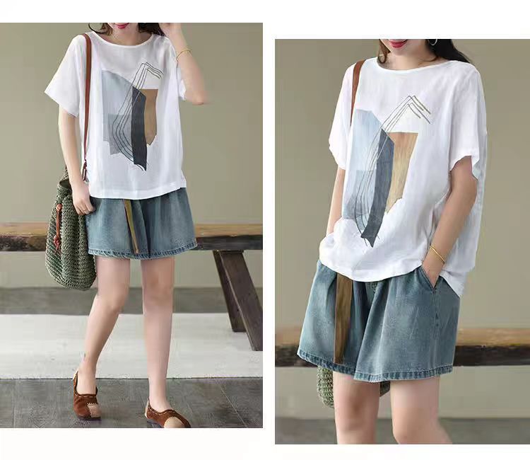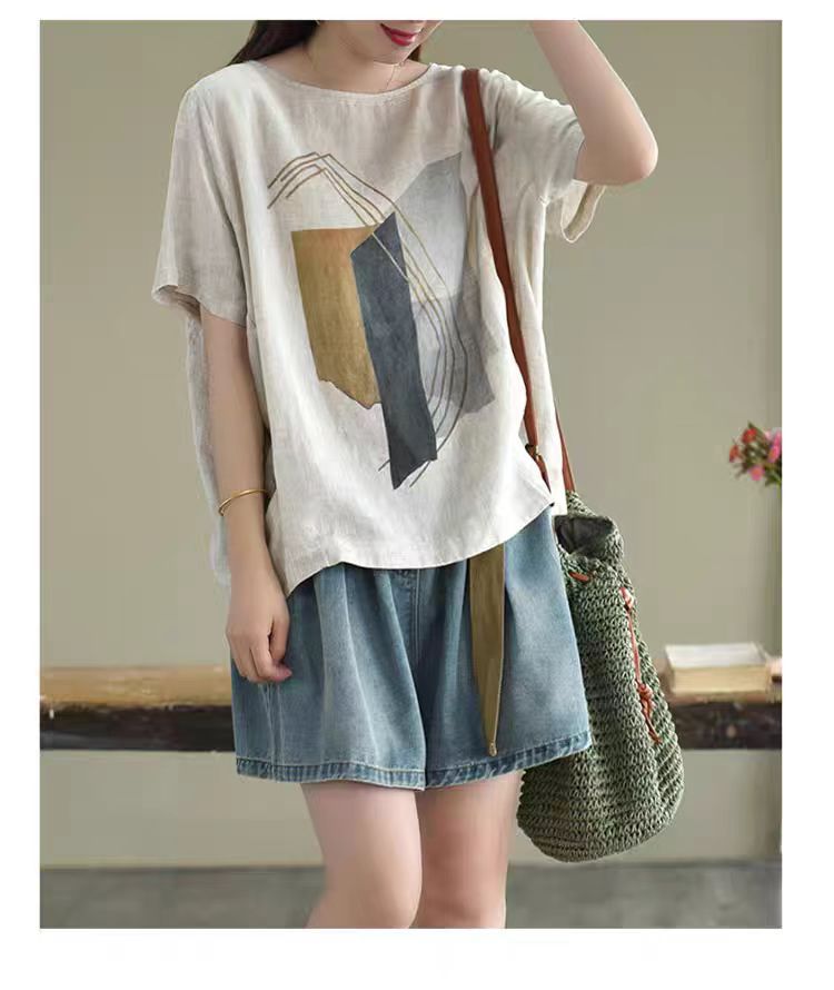 森女系印花棉麻休閒寬鬆大碼短袖T恤