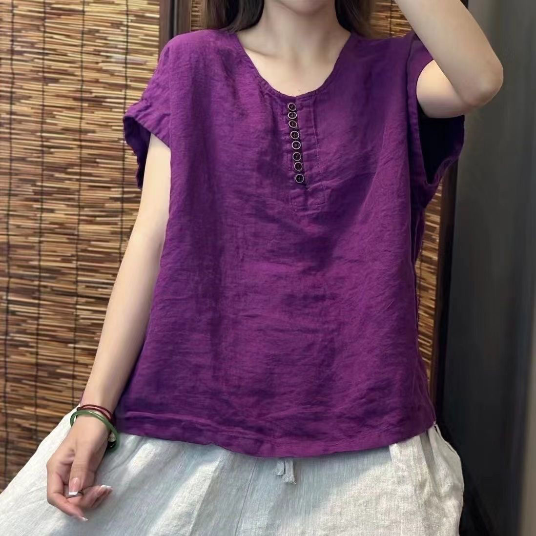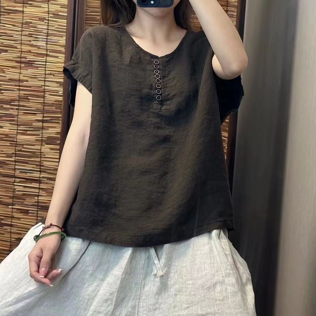 復古休閒簡約寬鬆純色棉麻圓領紐扣短袖T恤