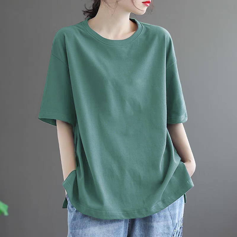 純色簡約休閒復古大碼遮肉寬鬆顯瘦百搭打底短袖T恤