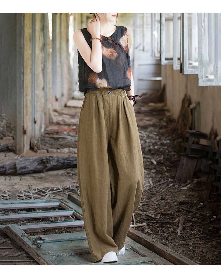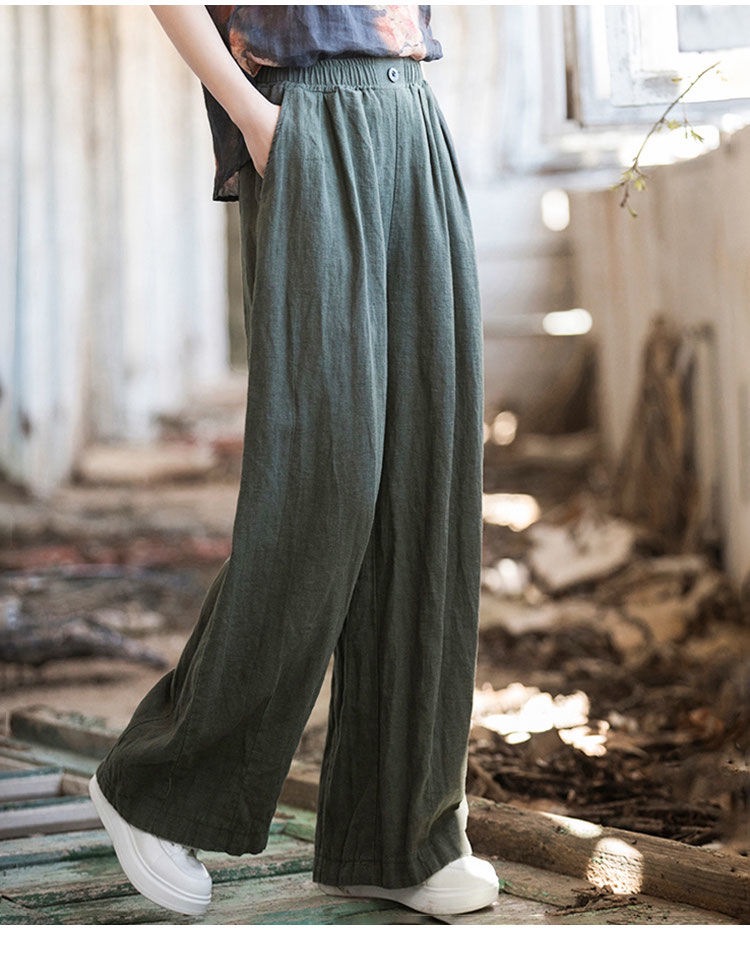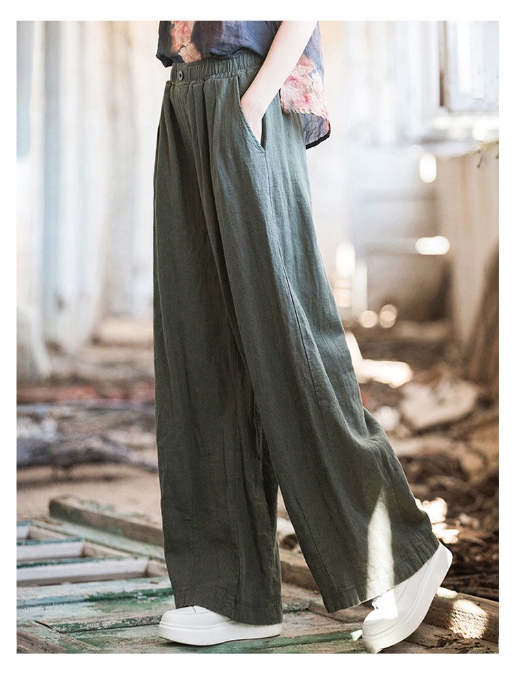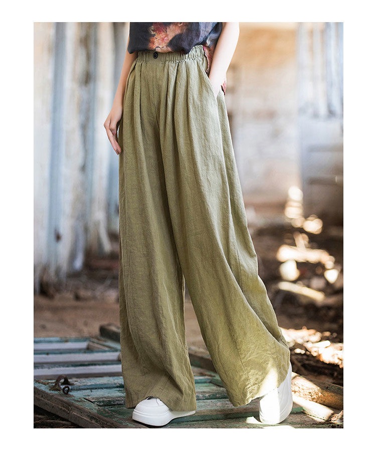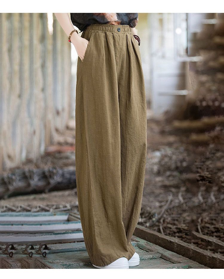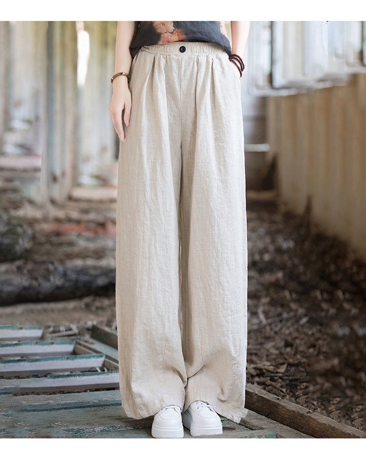 薄款闊腿直筒寬鬆高腰棉麻復古休閒拖地長褲