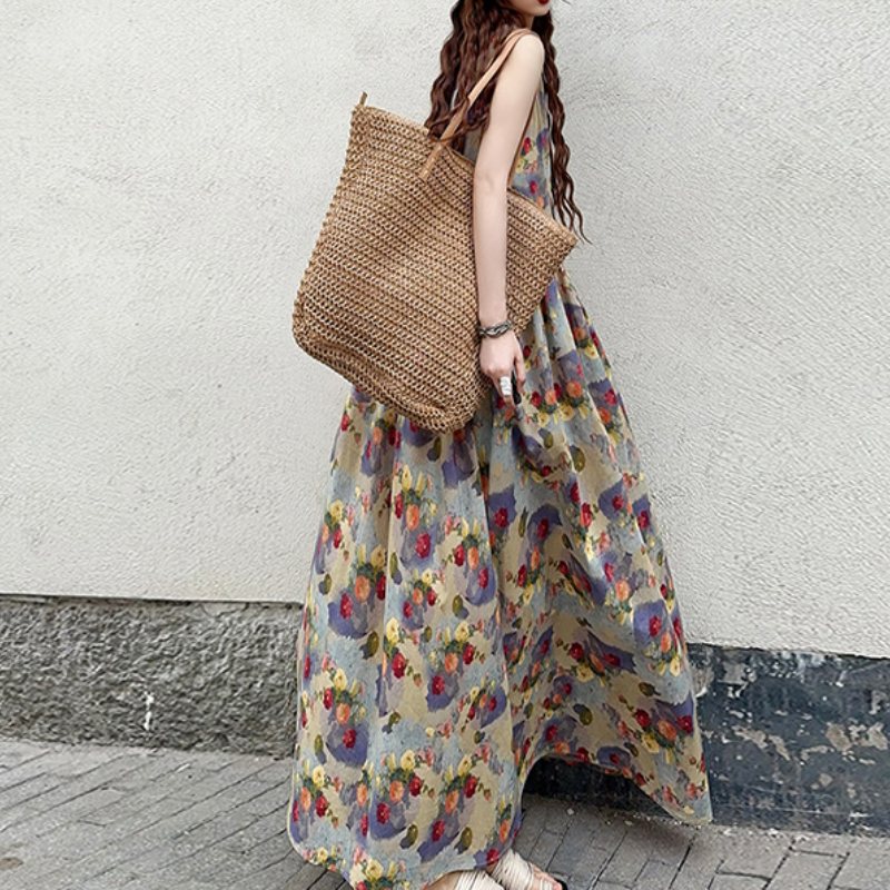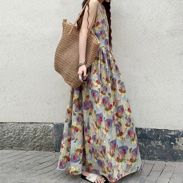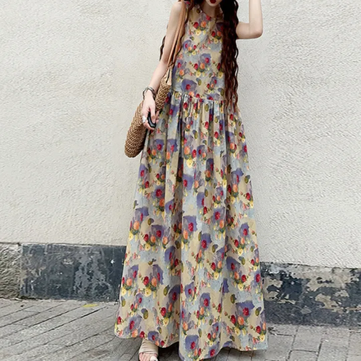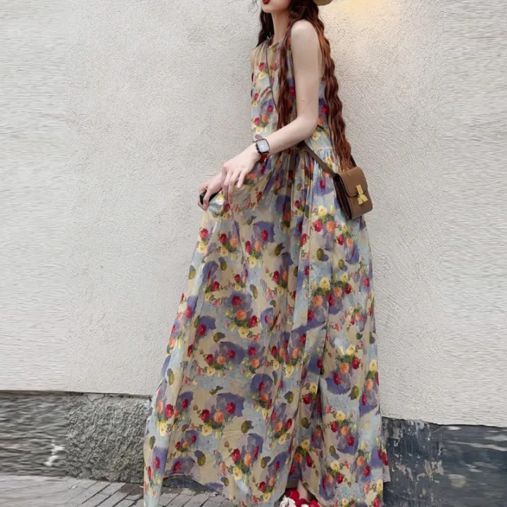 油畫風復古印花背心清新減齡韓系A字甜美洋裝