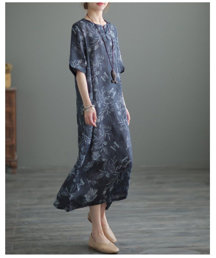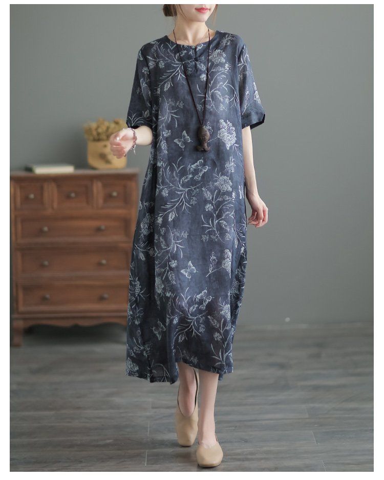 文藝復古民族風改良版印花寬鬆苧麻旗袍洋裝