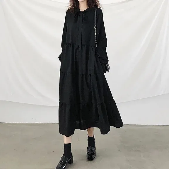 日系顯瘦保暖純色寬鬆連帽加絨遮肚洋裝