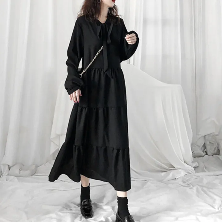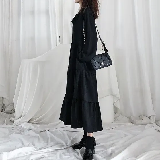 法式桔梗寬鬆氣質復古小黑溫柔風雪紡洋裝