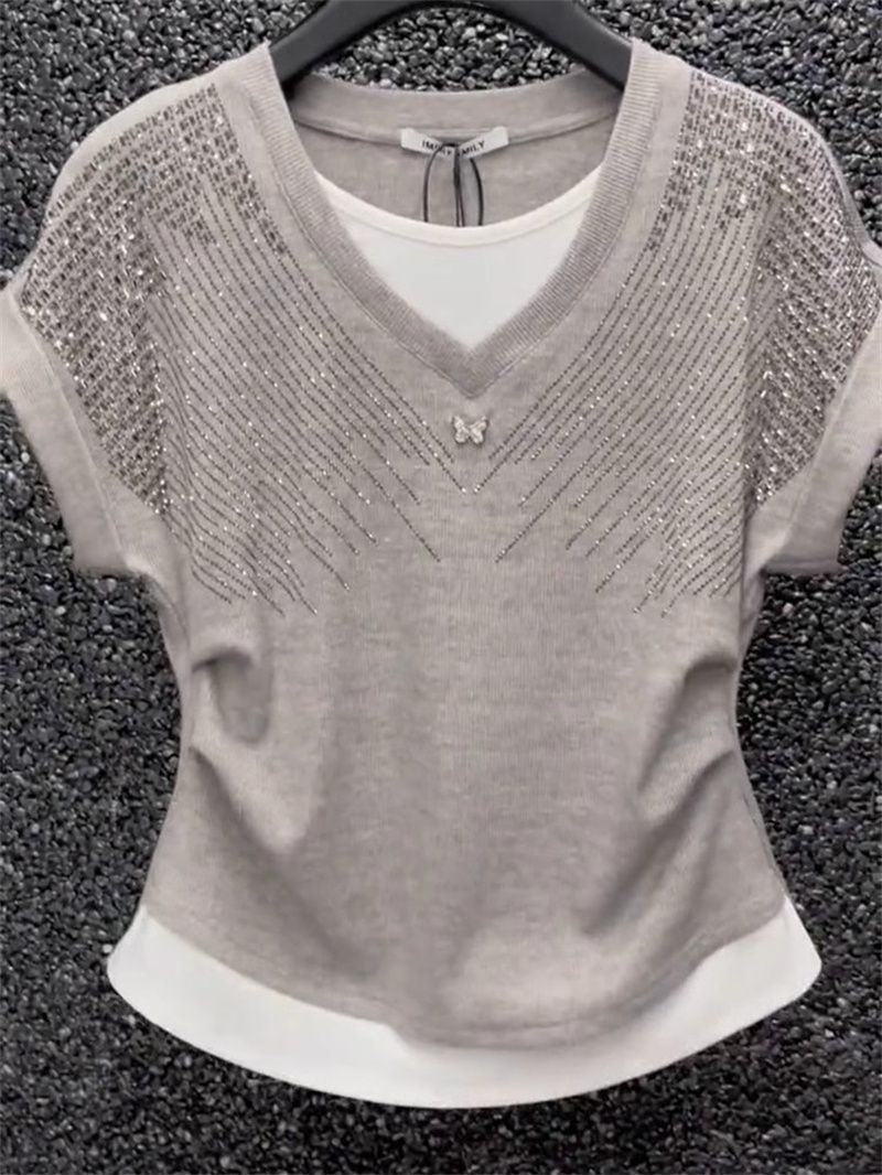 燙鑽撞色假兩件氣質V領洋氣重工收腰顯瘦小香風短袖T恤