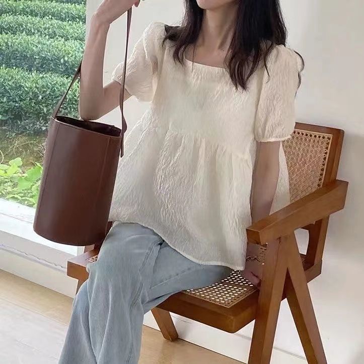 法式肌理感方領泡泡袖遮肉寬鬆短袖上衣