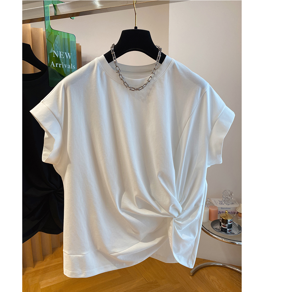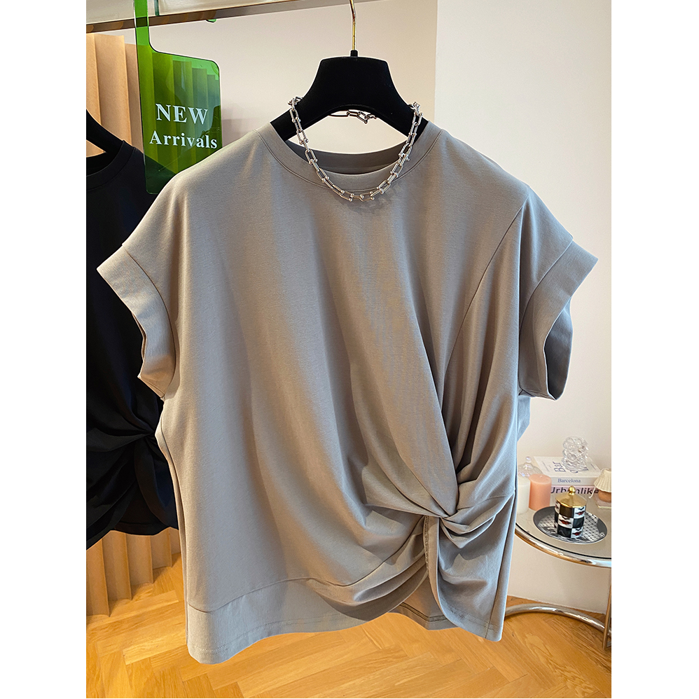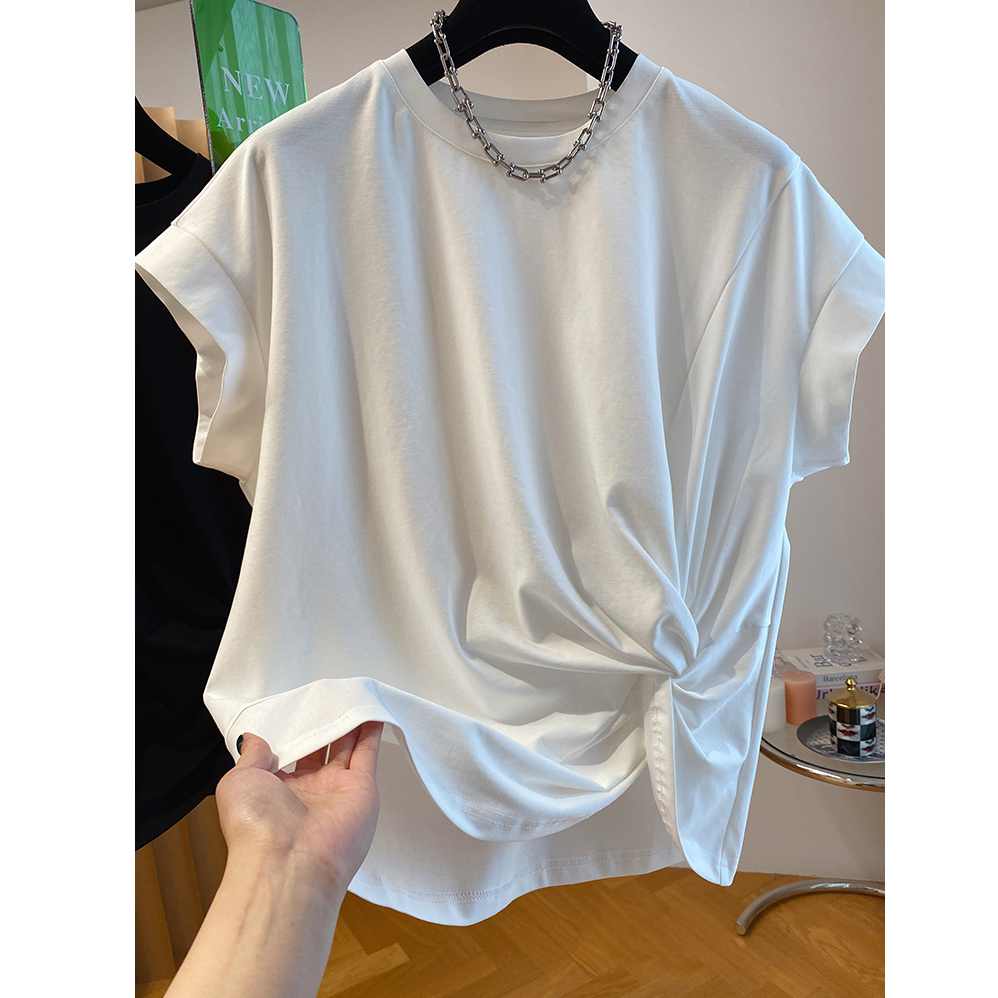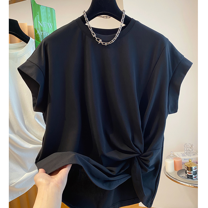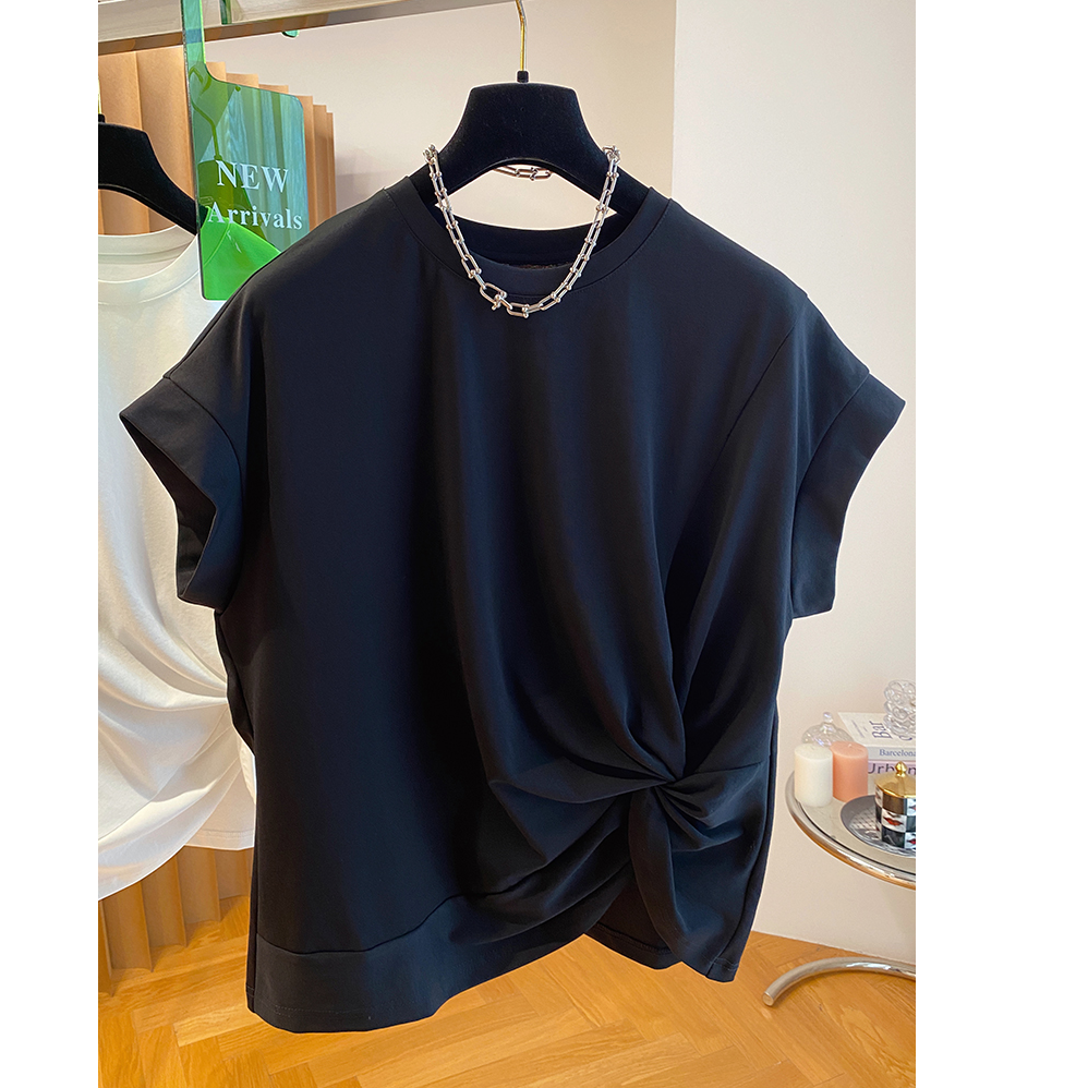 設計感不規則扭結寬鬆黑色小飛袖短袖T恤