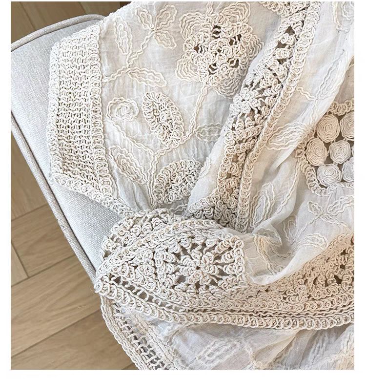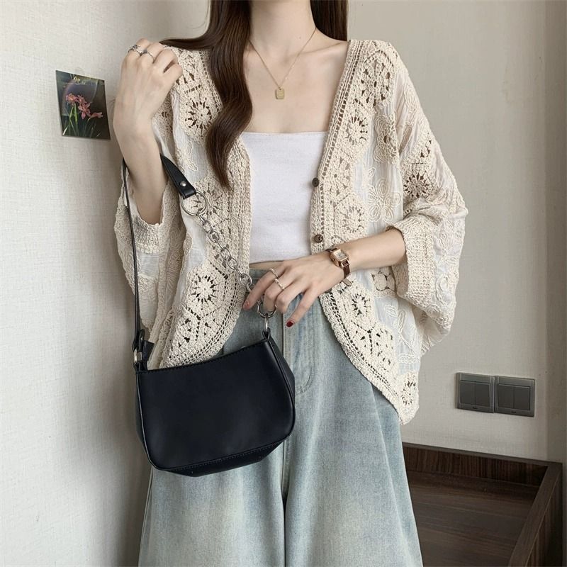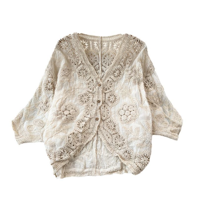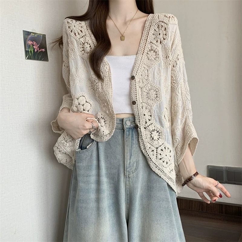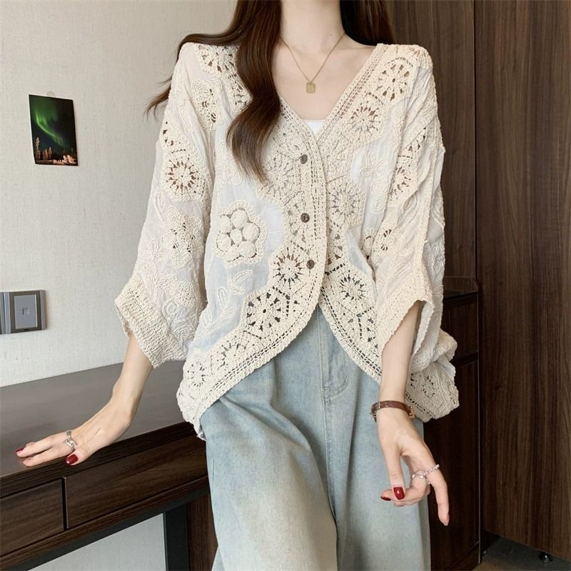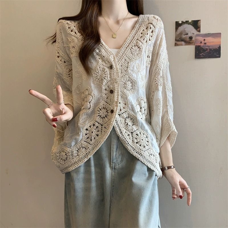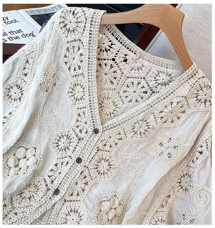 波西米亞風鉤花鏤空V領大碼胖外搭防曬開衫