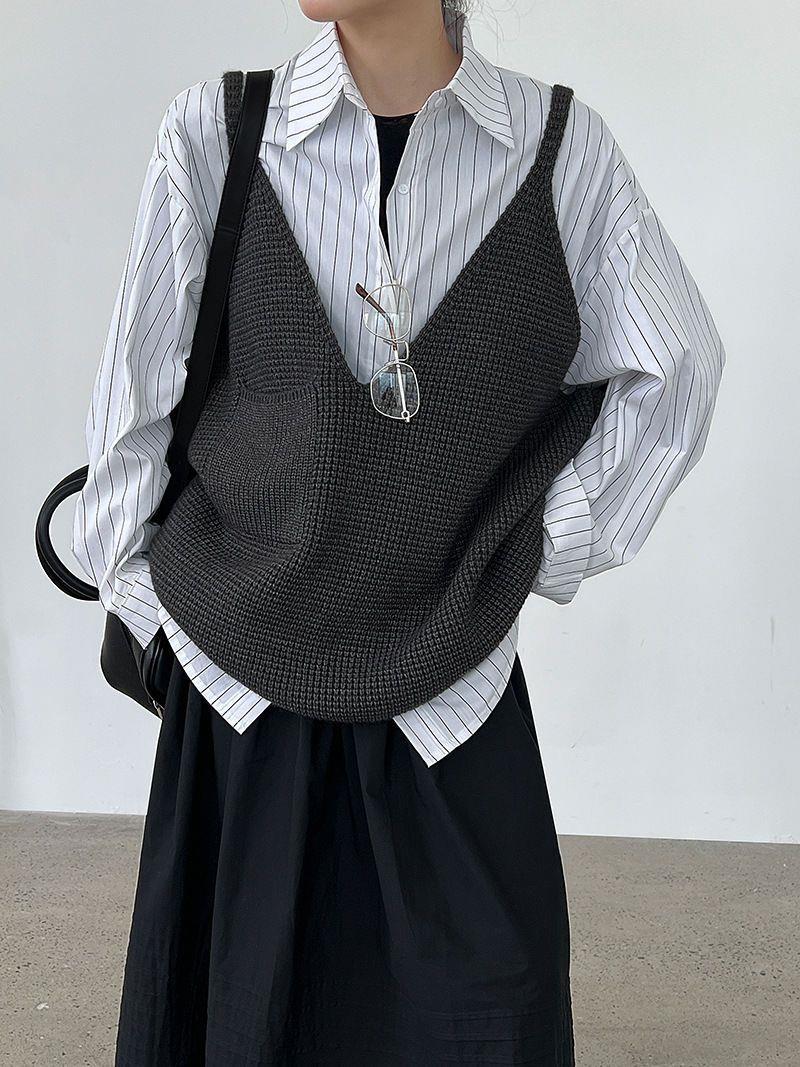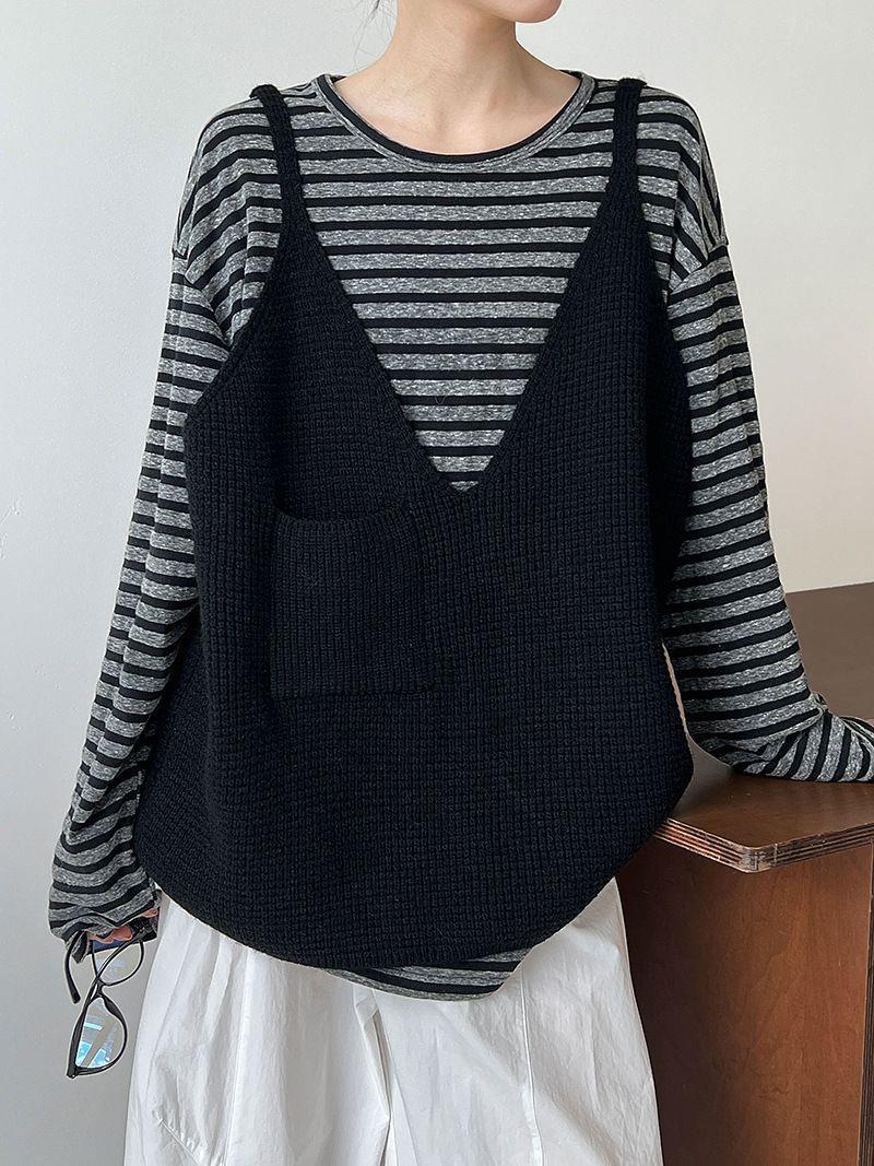 【單件/整套】V領寬鬆拼色百搭背心針織打底長袖T恤兩件套