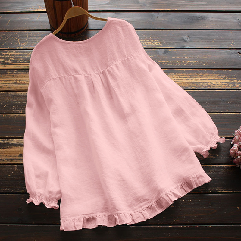 純色簡約寬鬆荷葉邊下脚袖口圓領長袖T恤