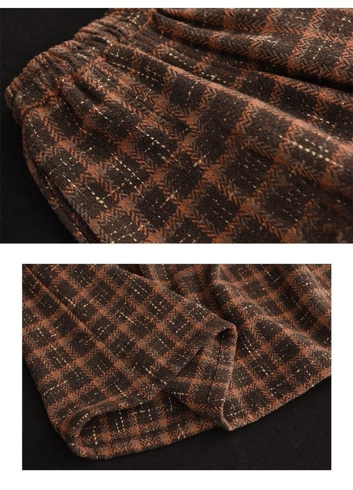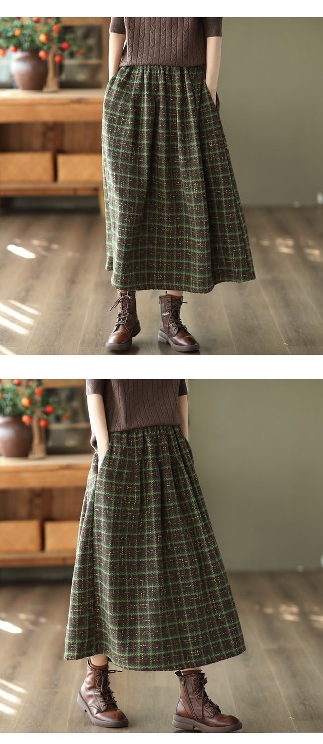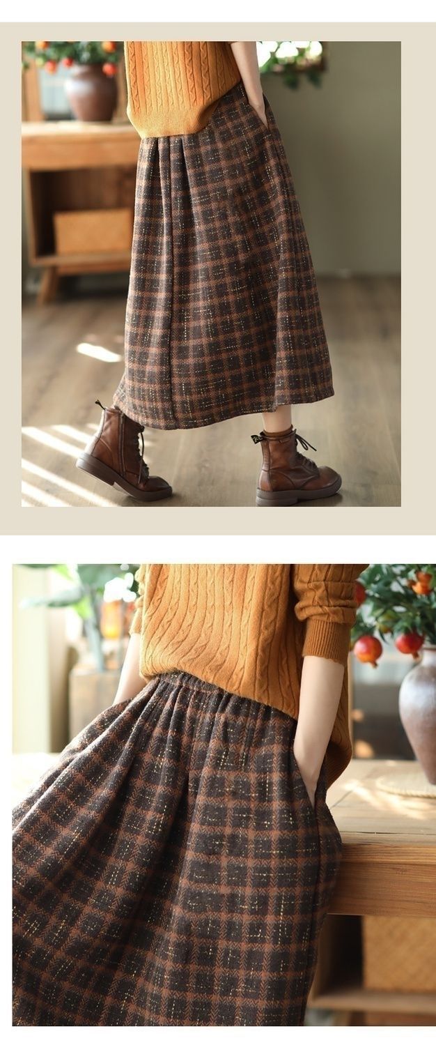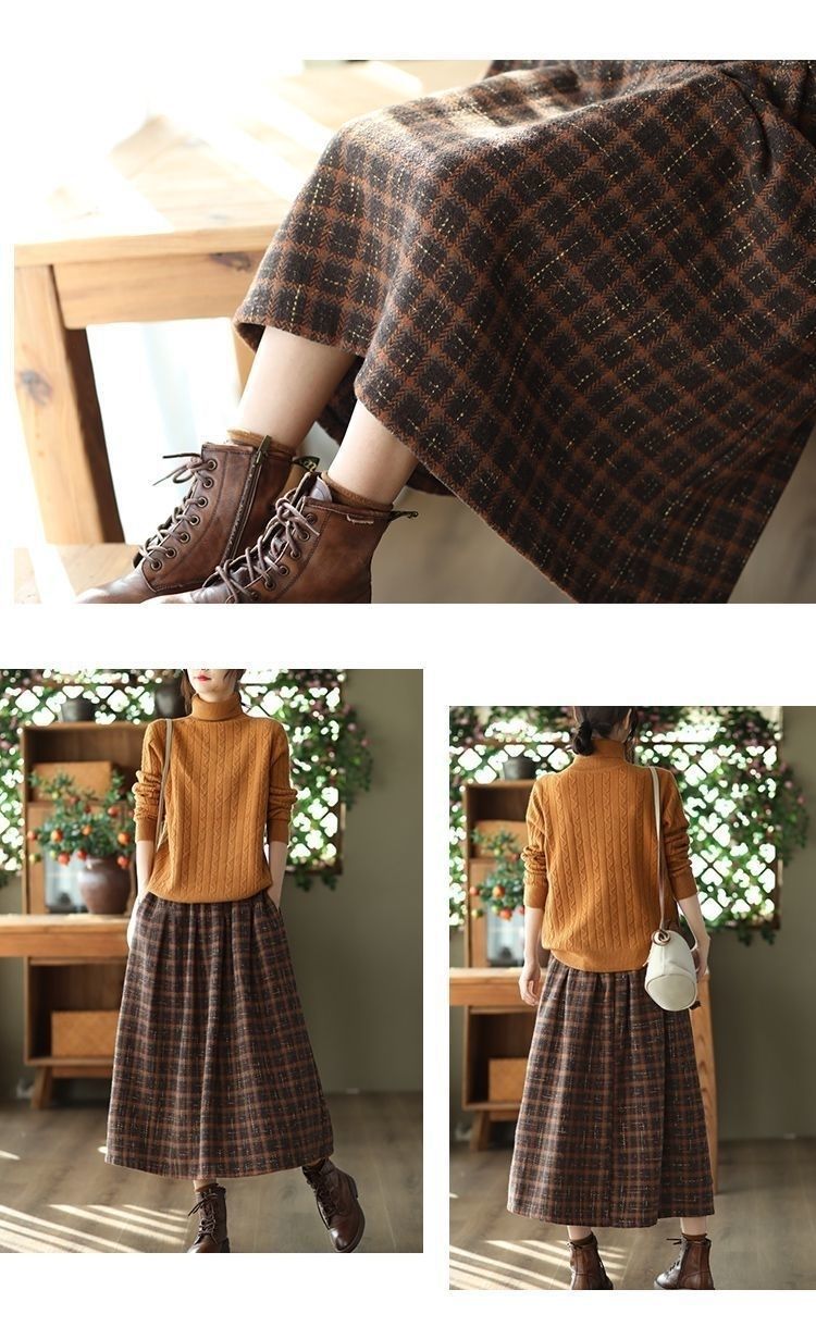 復古鬆緊腰高級感格子毛呢A字半身裙