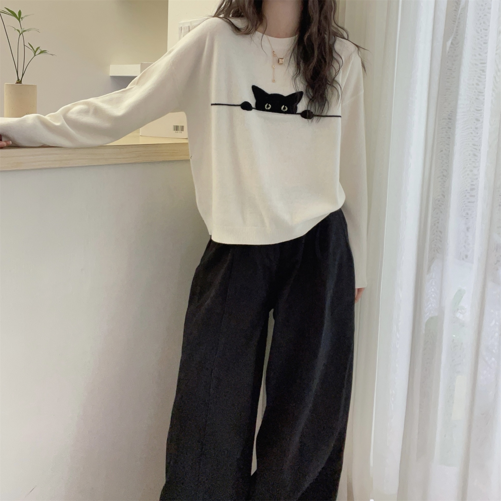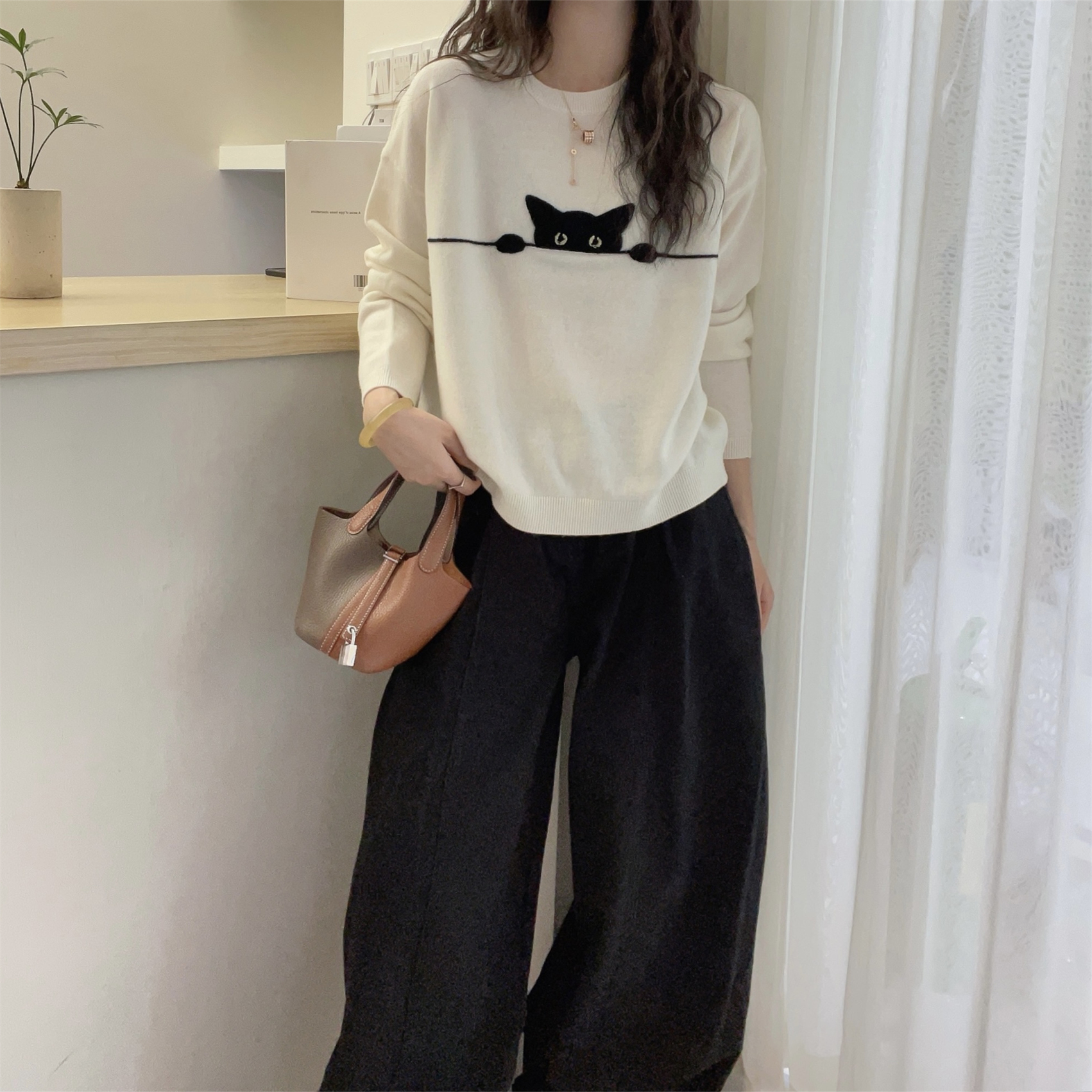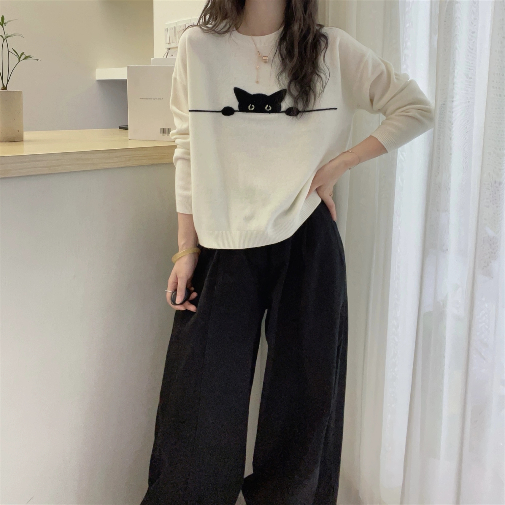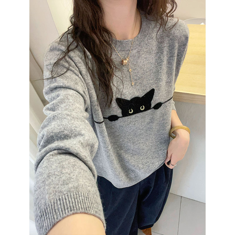 卡通猫咪提花圓領寬鬆顯瘦簡約百搭針織衫
