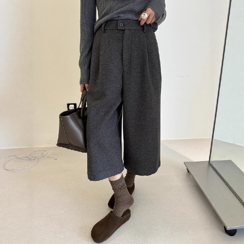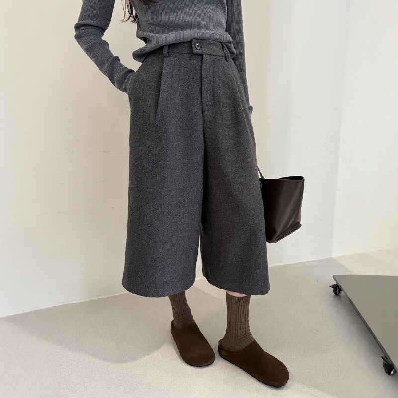 時尚高腰顯瘦加厚寬鬆復古直筒毛呢七分闊腿褲