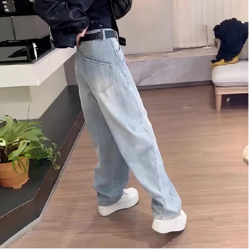 美式高街高腰寬鬆直筒洗水彎刀窄版牛仔褲