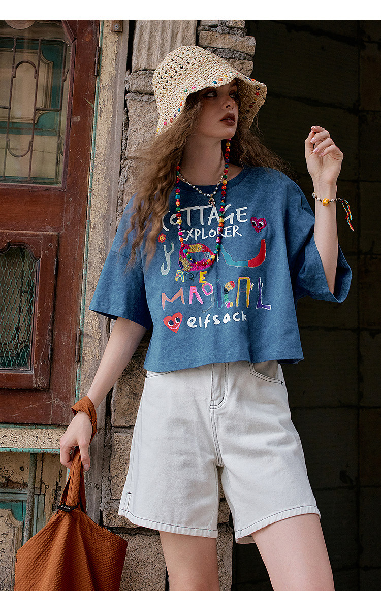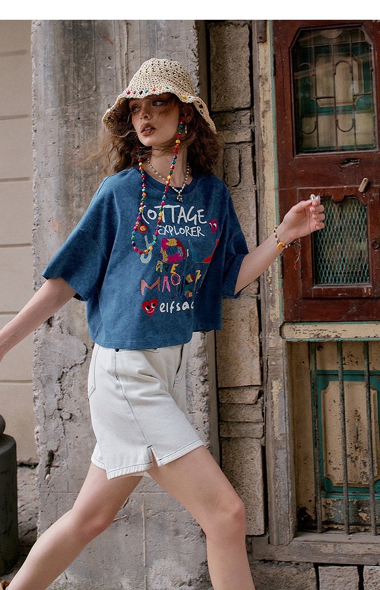復古純棉V領慵懶風設計感小眾寬鬆短袖t恤