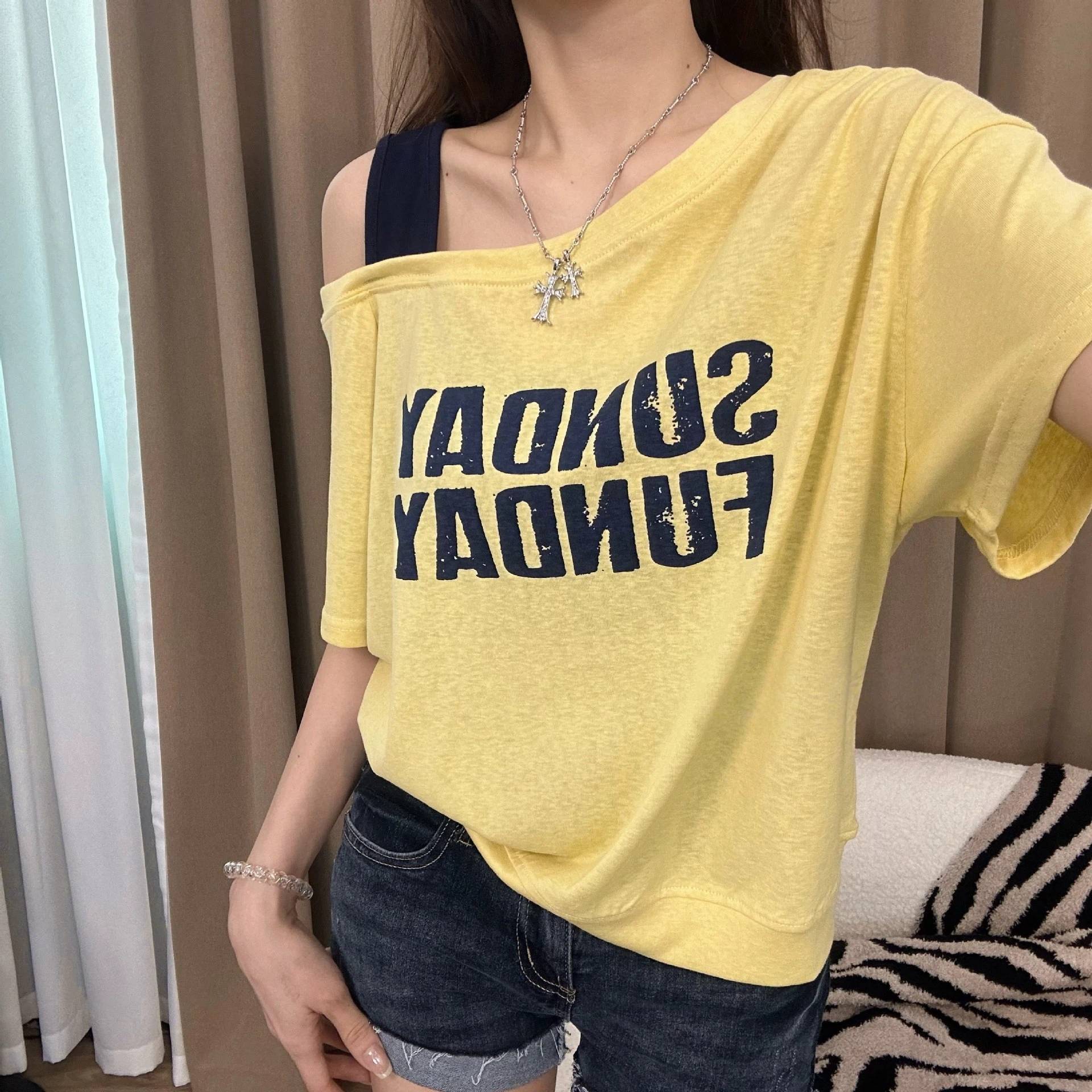 時尚寬鬆顯瘦百搭韓版斜肩撞色字母休閒印花短袖T桖