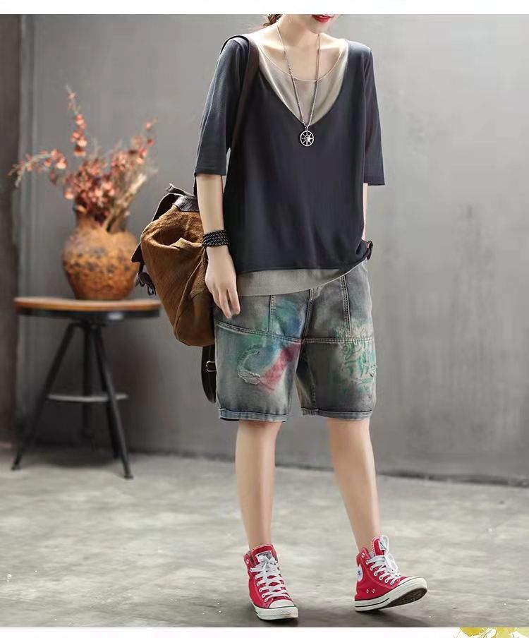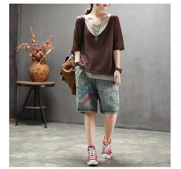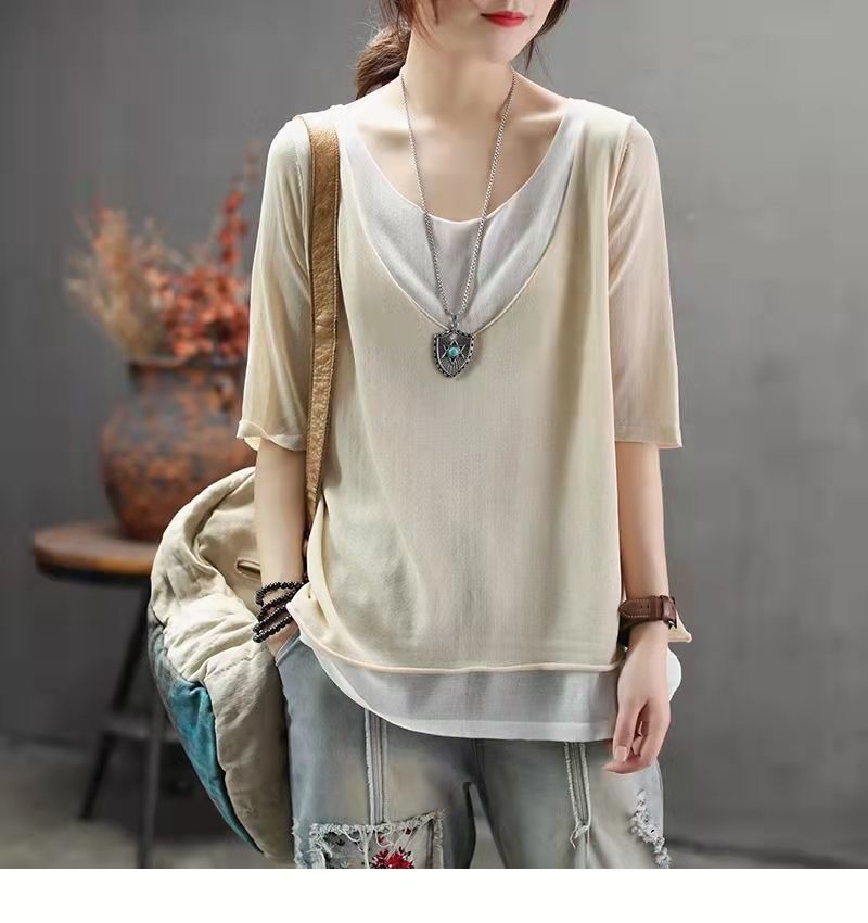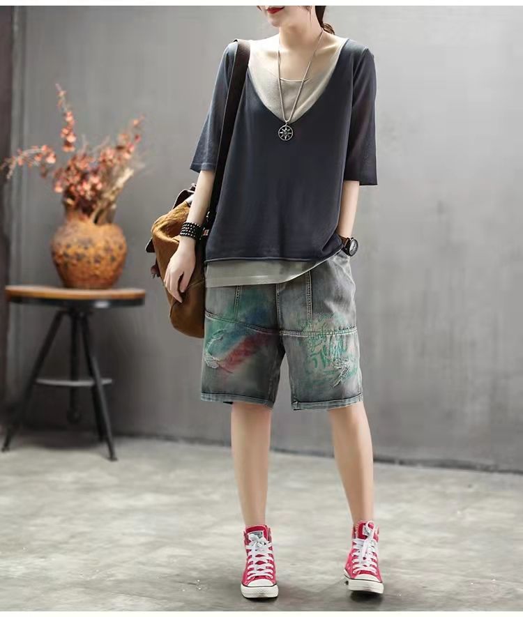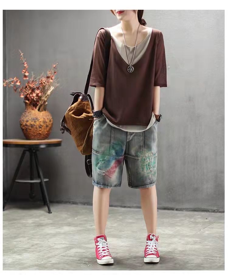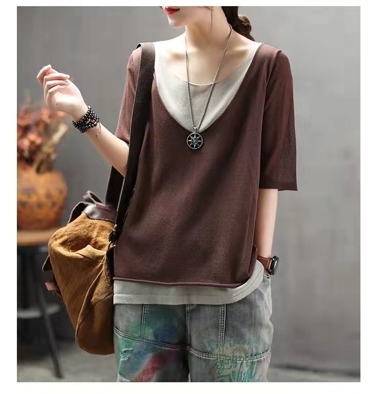 棉麻假兩件拼色v領寬鬆休閒百搭短袖T恤